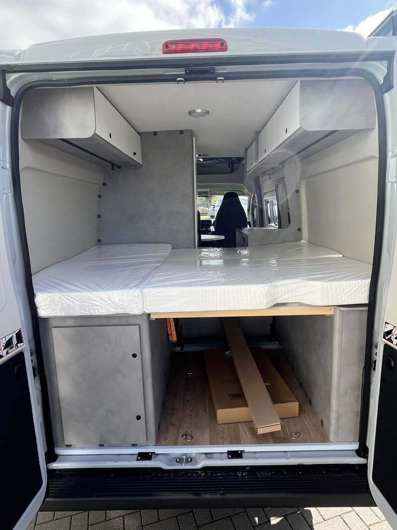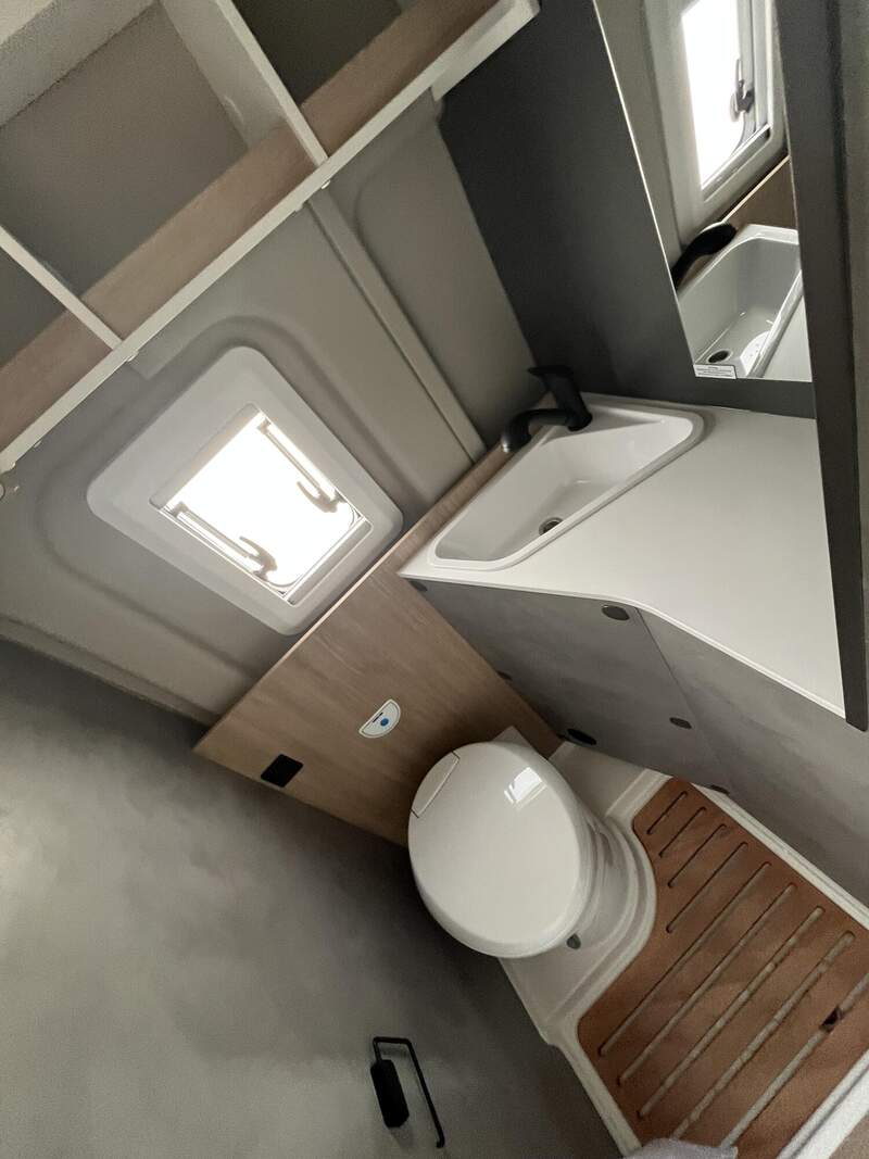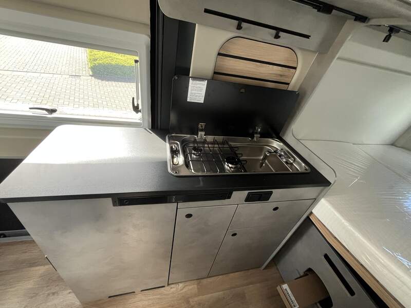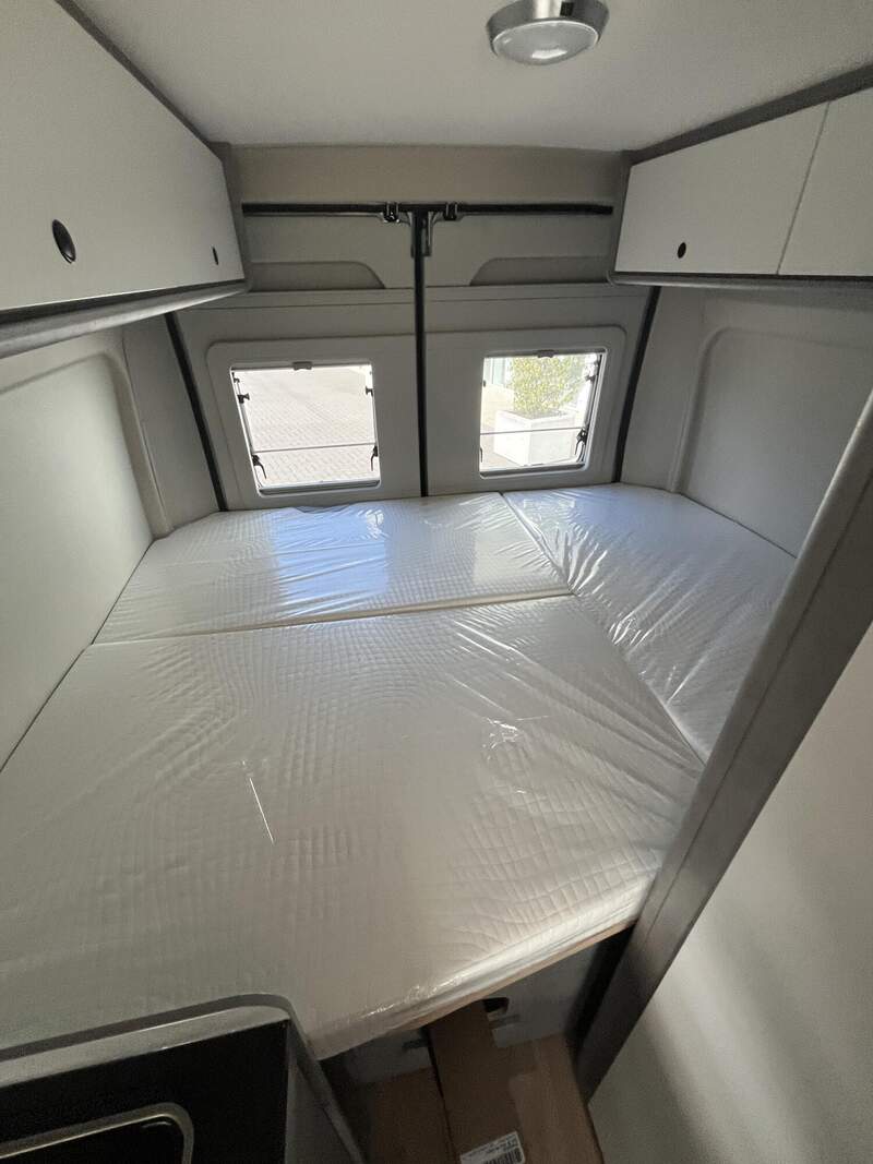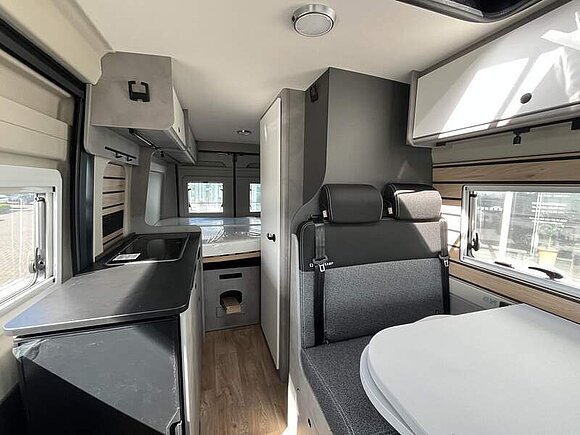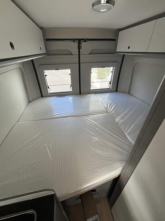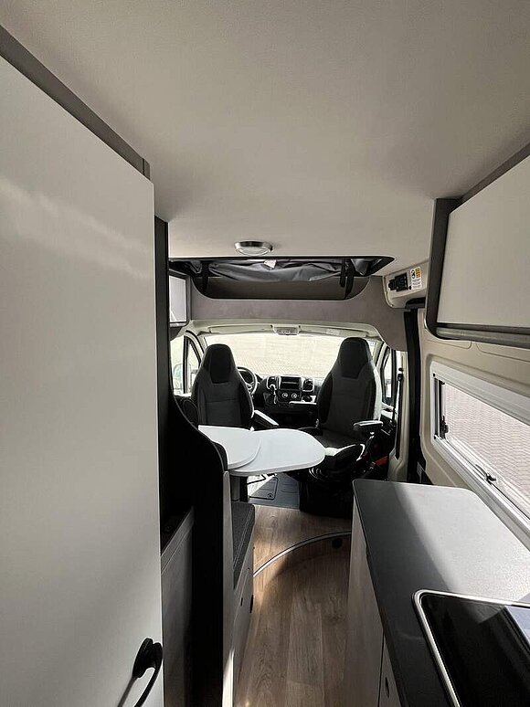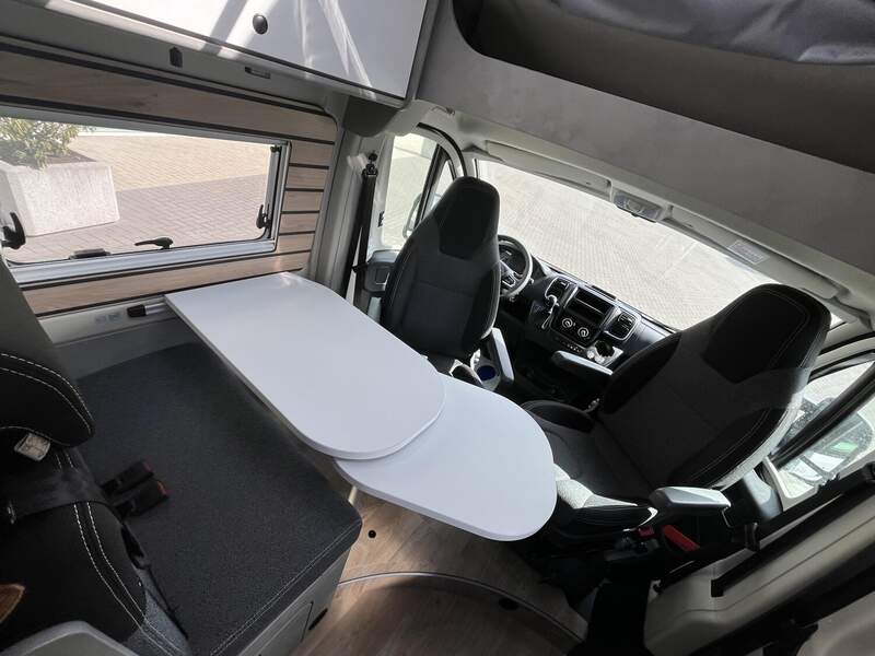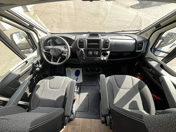 Base Kit (Falt-Sichtschutz in Fahrerhaus: Frontscheibe, Falt-Sichtschutz in Fahrerhaus: Seitenscheiben, Dachhaube Midi-Heki 70 x 50 cm über der Sitzgruppe mit Fliegenschutz und Verdunklungsrollo, Rahmenfenster im Wohnbereich (in Hecktüren Ausstellfenster), Fenster im Bad, Elektrische Einstiegsstufe, Holzrost in der Dusche, Kleiderstange im Bad, Drehplatte für Tischerweiterung, Duschausstattung (Brausekopf ausziehbar, Duschvorhang, Führungsschiene, Brausehalter))