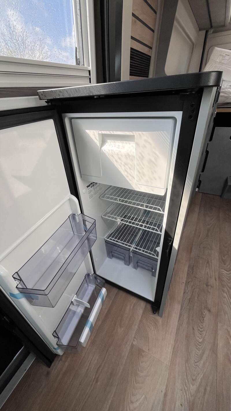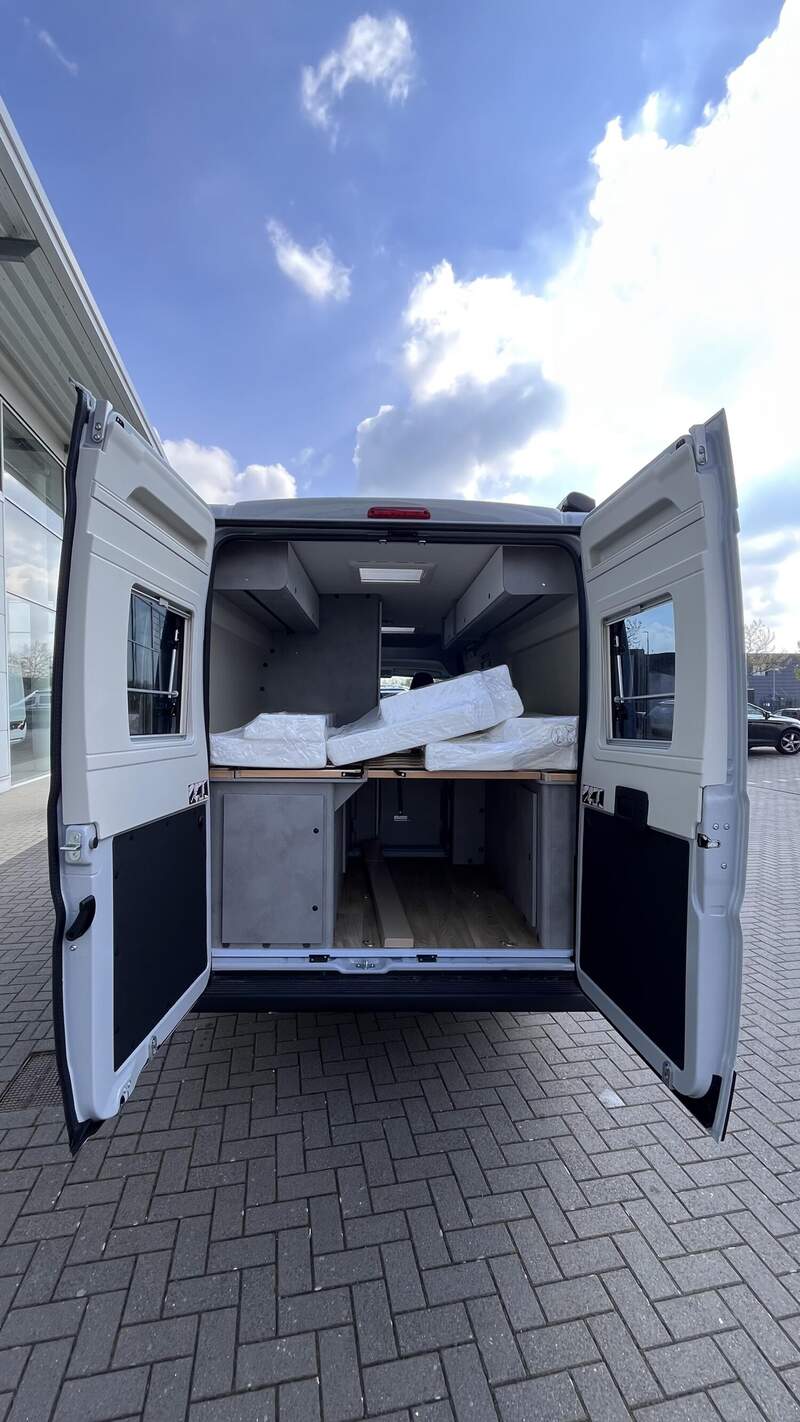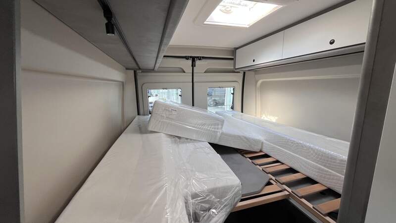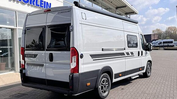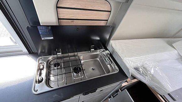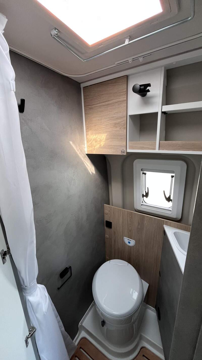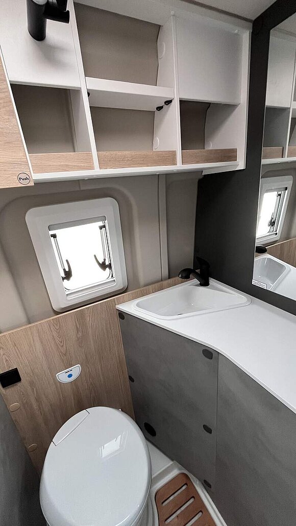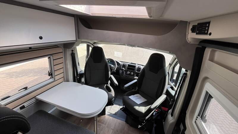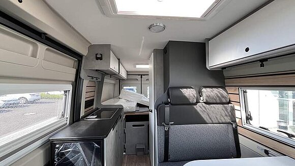 Base Kit (Falt-Sichtschutz in Fahrerhaus: Frontscheibe, Falt-Sichtschutz in Fahrerhaus: Seitenscheiben, Dachhaube Midi-Heki 70 x 50 cm über der Sitzgruppe mit Fliegenschutz und Verdunklungsrollo, Rahmenfenster im Wohnbereich (in Hecktüren Ausstellfenster), Fenster im Bad, Elektrische Einstiegsstufe, Holzrost in der Dusche, Kleiderstange im Bad, Drehplatte für Tischerweiterung, Duschausstattung (Brausekopf ausziehbar, Duschvorhang, Führungsschiene, Brausehalter))