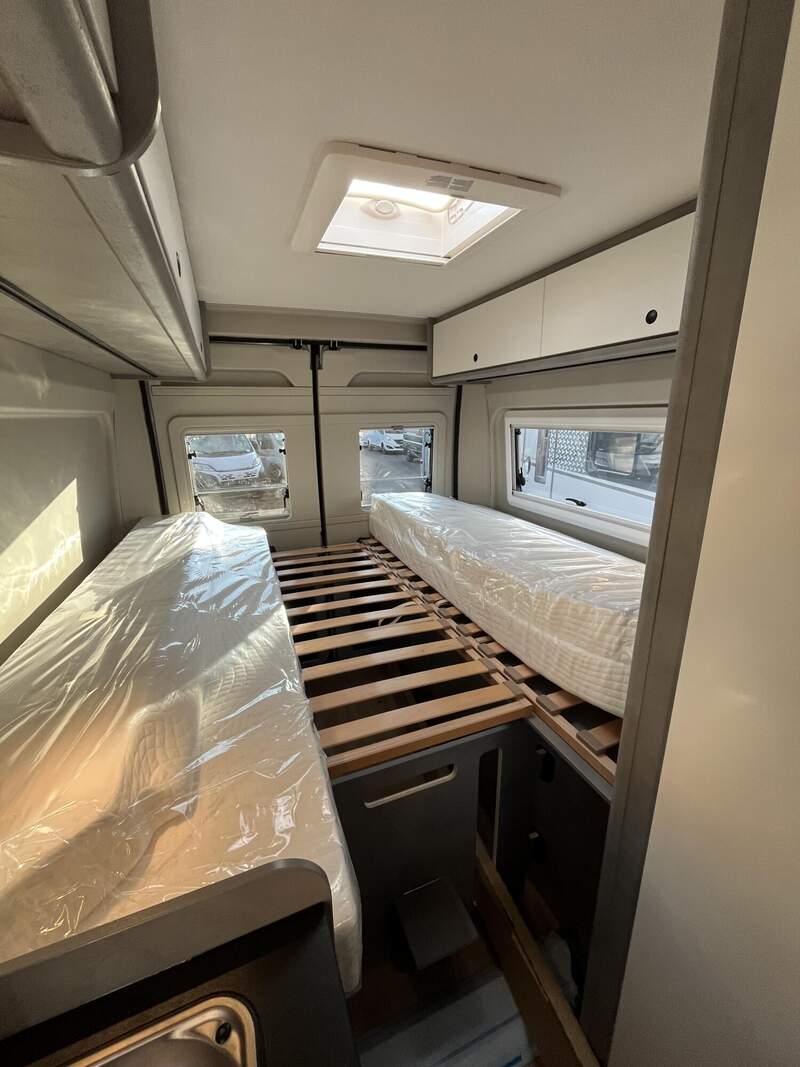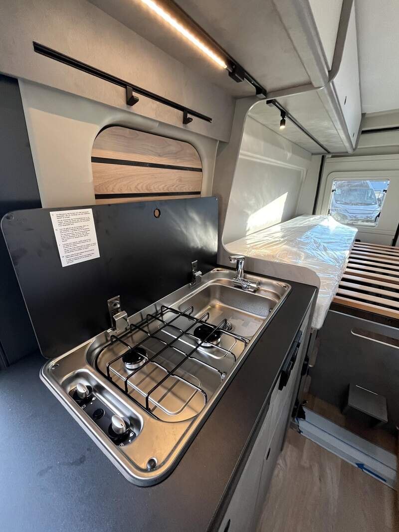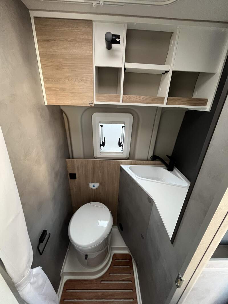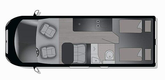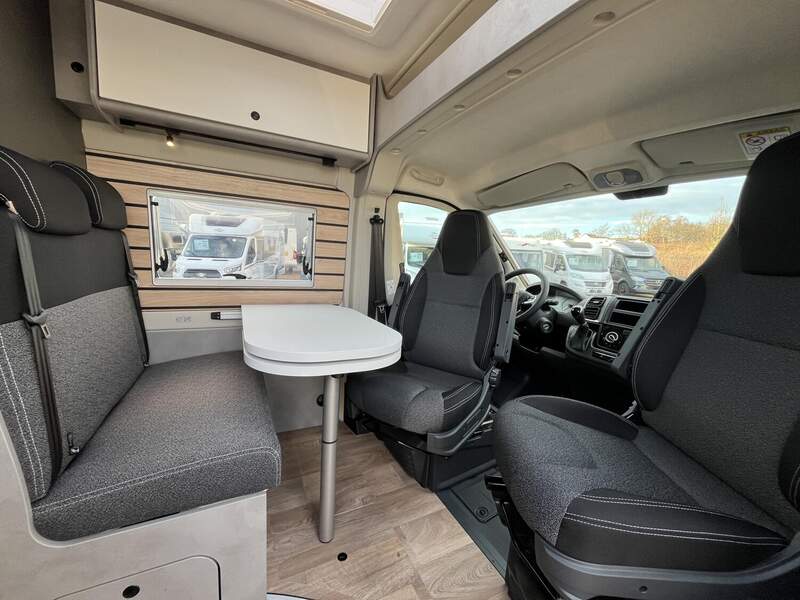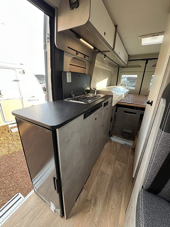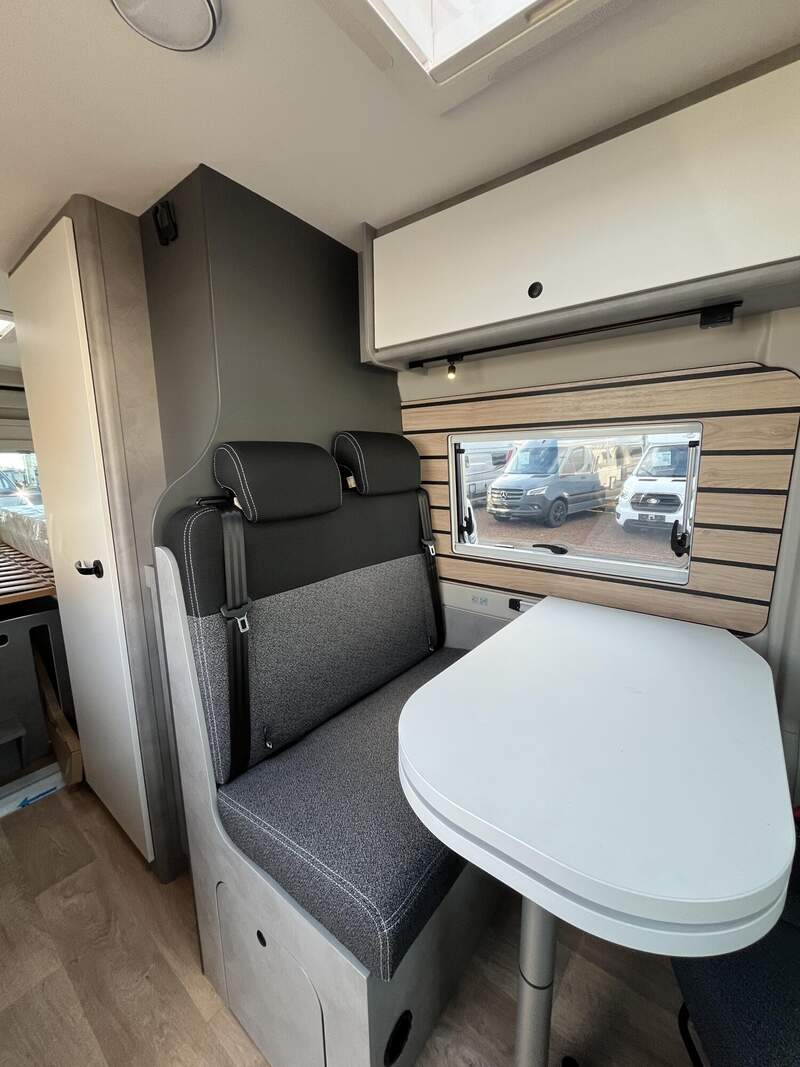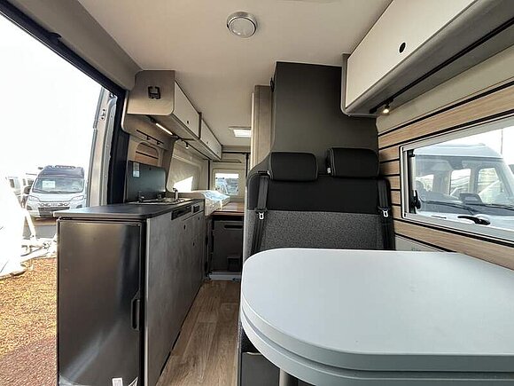 Base Kit (Falt-Sichtschutz in Fahrerhaus: Frontscheibe, Falt-Sichtschutz in Fahrerhaus: Seitenscheiben, Dachhaube Midi-Heki 70 x 50 cm über der Sitzgruppe mit Fliegenschutz und Verdunklungsrollo, Rahmenfenster im Wohnbereich (in Hecktüren Ausstellfenster), Fenster im Bad, Elektrische Einstiegsstufe, Holzrost in der Dusche, Kleiderstange im Bad, Drehplatte für Tischerweiterung, Duschausstattung (Brausekopf ausziehbar, Duschvorhang, Führungsschiene, Brausehalter))