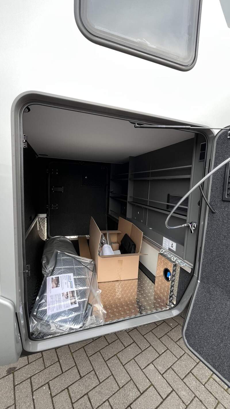 Arktis Paket (Gas-Warmwasserheizung inkl. Garagenbodenheizung, Wärmetauscher für Gas-Warmwasserheizung, Wärmetauscher-Vorbereitung Mercedes-Benz, Komfort-Eingangstür mit Fenster, Verdunkelungsrollo, integriertem Mülleimer und 2-fach Verriegelung, Riffelblechboden in Heckgarage, Isolierverglasung für Fahrerhausseitenfenster und Fahrertür, Isoliermatte für Frontscheibe außen, Isoliermatte für Fahrerhaus-Fußraum, lose beigelegt, Zuheizer (unterstützt die Heizung beim Erwärmen des Fahrzeugs))