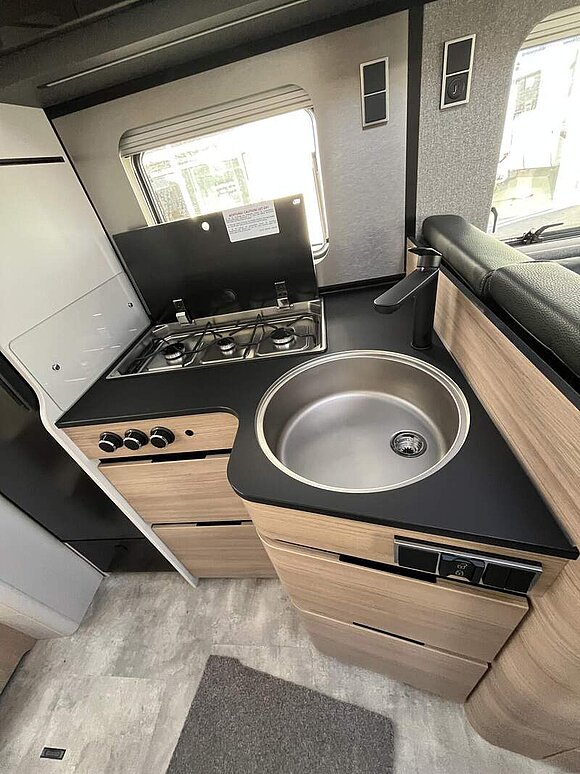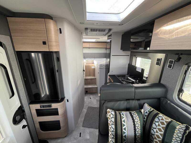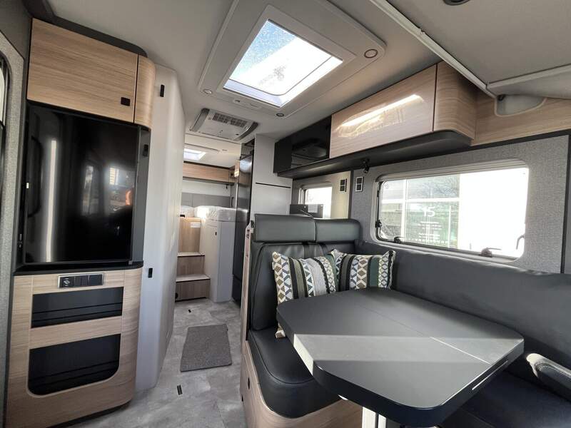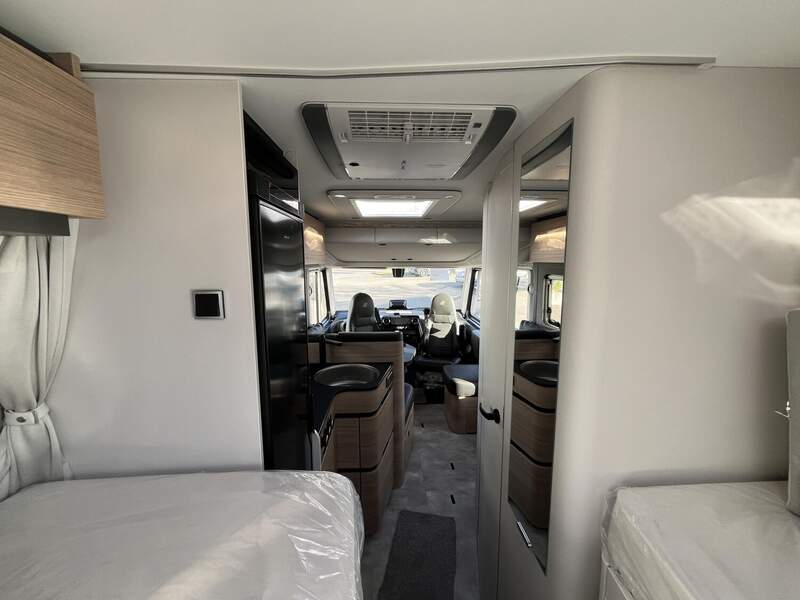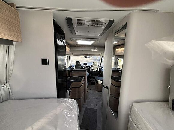 Wohnkomfort-Paket (Filzverkleidung in Heckgarage, Spannbettlaken nach Maß für Heckbetten individuell an Matratzen angepasst, 2 Kissen mit Bezug, Ambient-Light-System: Mehr-Ebenen Lichtsystem mit dynamischer und individueller Steuerung der Beleuchtung (inkl. Lichttemperatur) sowie stimmungsvoller Sockelbeleuchtung, 4 x 230 V / 2 x Doppel-USB Zusatzsteckdosen)