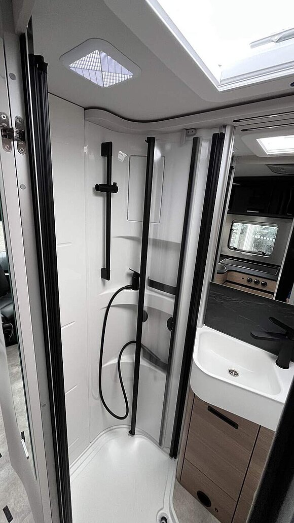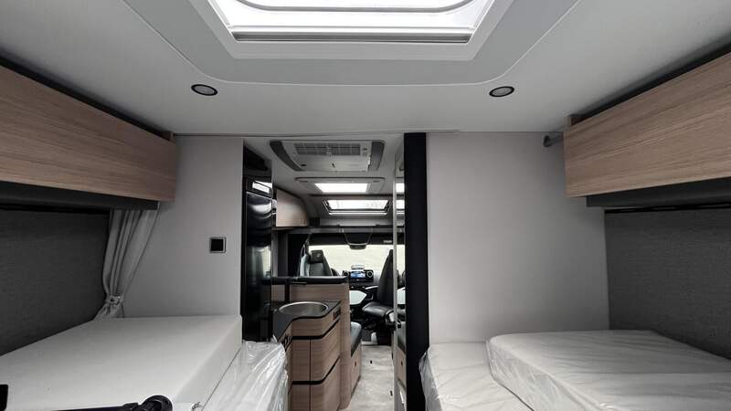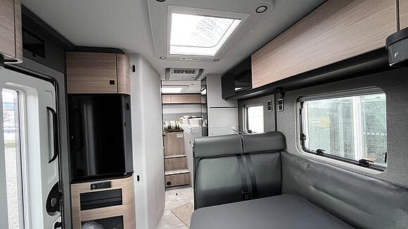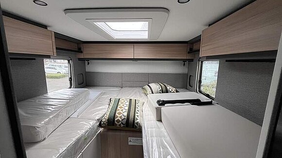 Wohnkomfort-Paket (Filzverkleidung in Heckgarage, Spannbettlaken nach Maß für Heckbetten individuell an Matratzen angepasst, 2 Kissen mit Bezug, Ambient-Light-System: Mehr-Ebenen Lichtsystem mit dynamischer und individueller Steuerung der Beleuchtung (inkl. Lichttemperatur) sowie stimmungsvoller Sockelbeleuchtung, 4 x 230 V / 2 x Doppel-USB Zusatzsteckdosen)