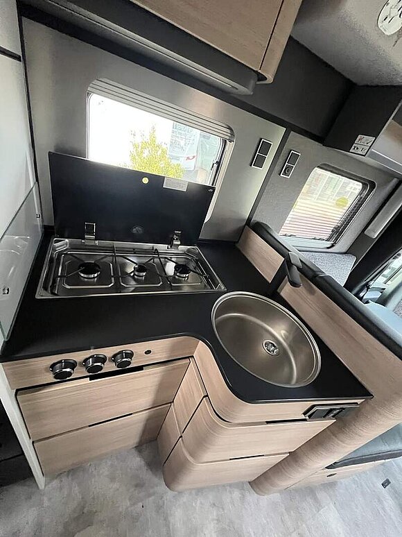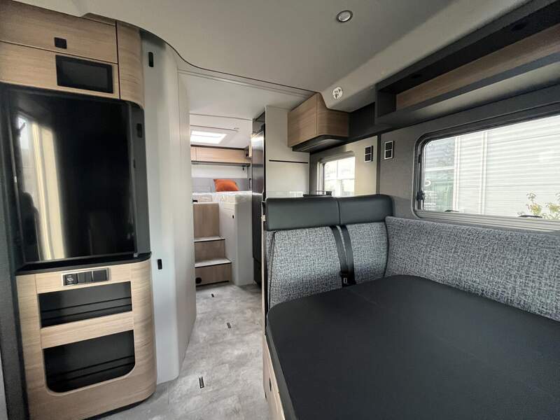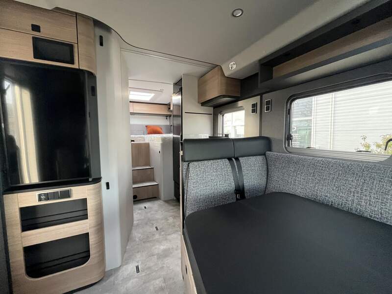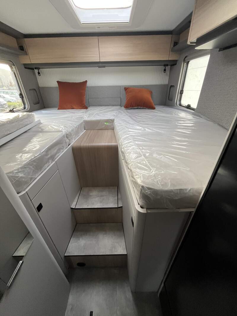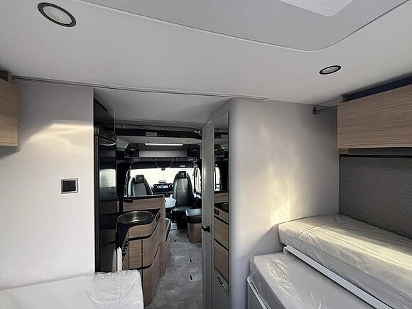 Wohnkomfort-Paket (Filzverkleidung in Heckgarage, Spannbettlaken nach Maß für Heckbetten individuell an Matratzen angepasst, 2 Kissen mit Bezug, Ambient-Light-System: Mehr-Ebenen Lichtsystem mit dynamischer und individueller Steuerung der Beleuchtung (inkl. Lichttemperatur) sowie stimmungsvoller Sockelbeleuchtung, 4 x 230 V / 2 x Doppel-USB Zusatzsteckdosen)