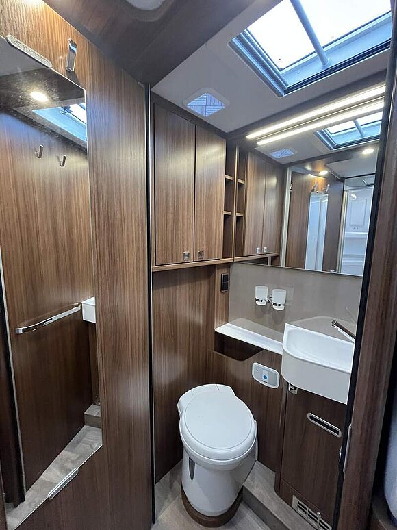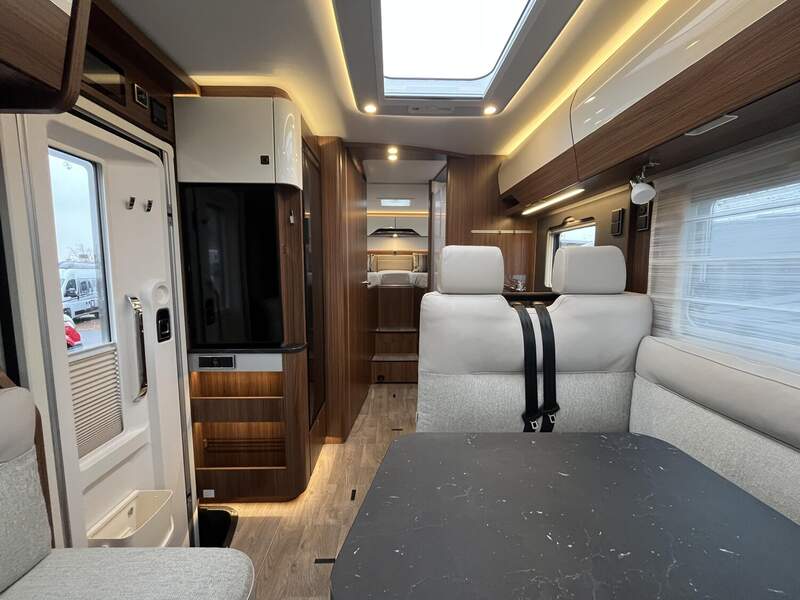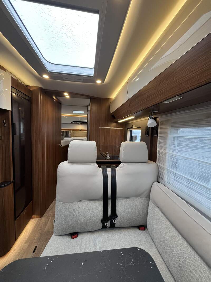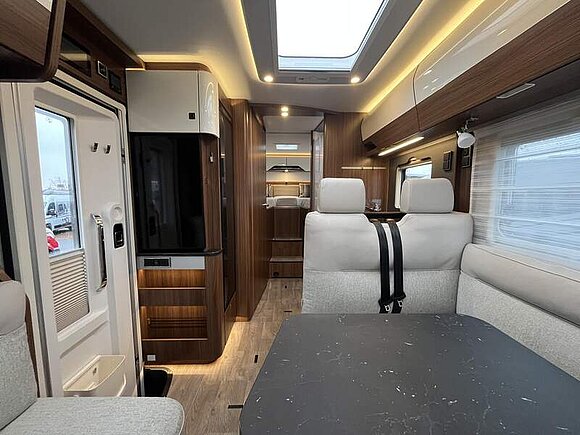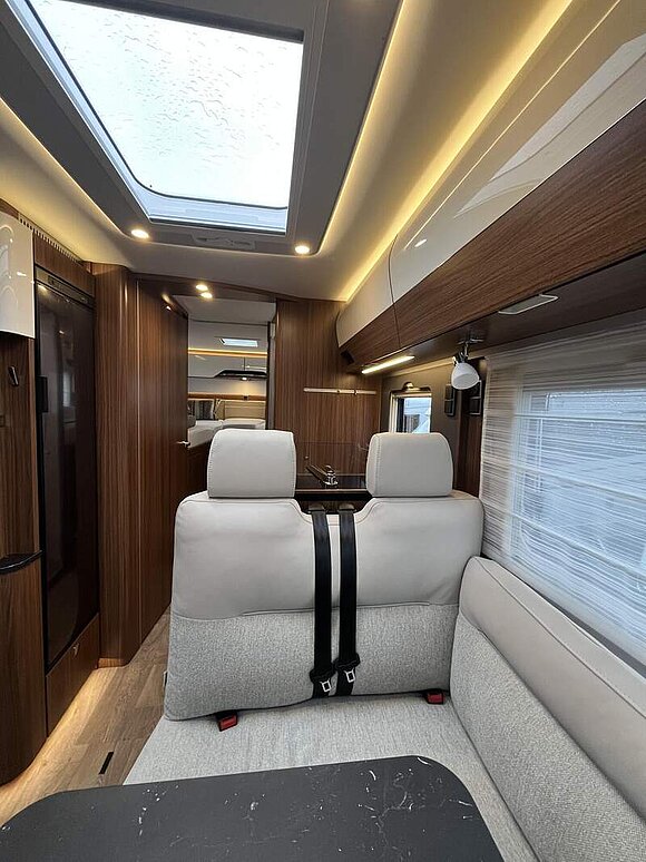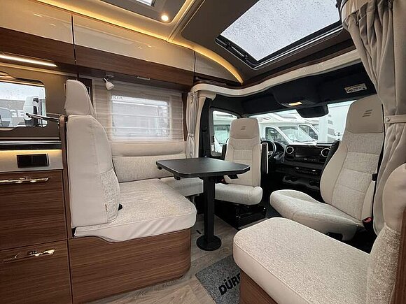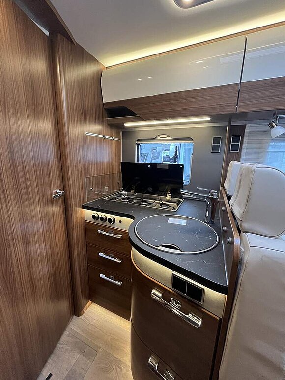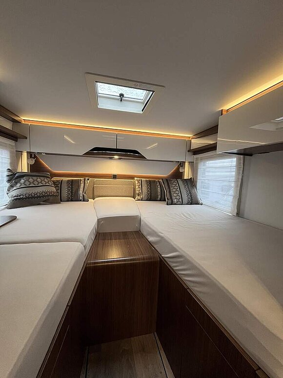 Wohnkomfort-Paket (Einlegeboden mit Holzoberfläche, Spannbettlaken nach Maß für Heckbetten individuell an Matratzen angepasst, 4 Kissen mit Bezug, Ambient-Light-System: Mehr-Ebenen Lichtsystem mit dynamischer und individueller Steuerung der Beleuchtung (inkl. Lichttemperatur) sowie stimmungsvoller Sockelbeleuchtung, 4 x 230 V / 1 x 12 V / 1 x Doppel-USB Zusatzsteckdosen (inkl. Küchenwand-Verkleidung))