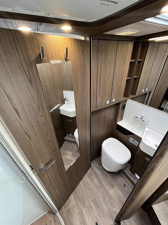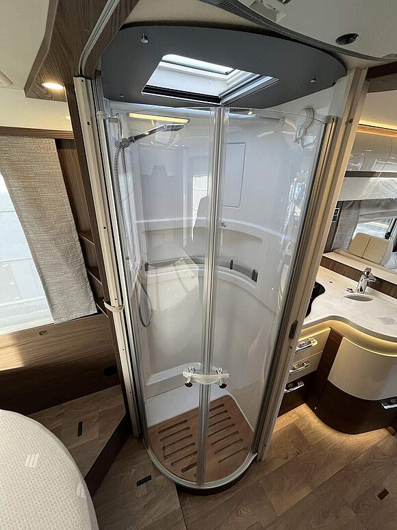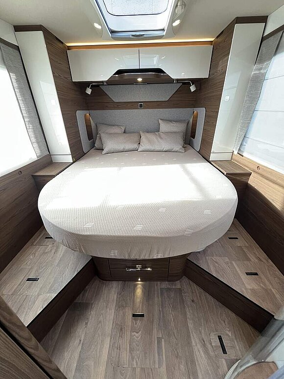 Wohnkomfort-Paket 3 (Holzlattenrost in der Dusche, 4 x 230 V / 1 x 12 V / 1 x Doppel-USB Zusatzsteckdosen sowie Wohnkomfortleuchten, Spannbettlaken nach Maß für Heckbetten individuell an Matratzenkonturen angepasst, 4 Kissen mit Bezug)