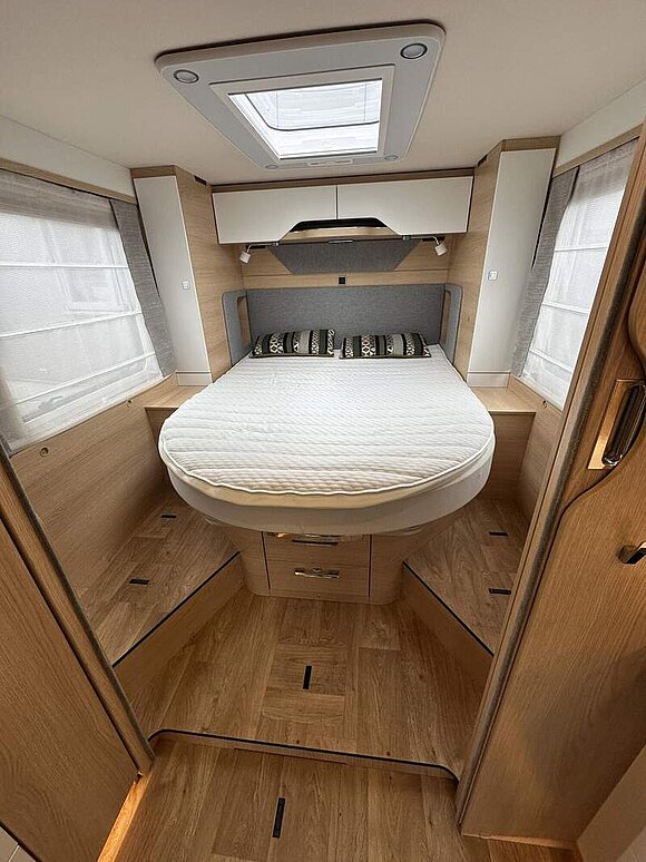 Wohnkomfort-Paket (Einlegeboden mit Holzoberfläche, 4 x 230 V / 1 x 12 V / 1 x Doppel-USB Zusatzsteckdosen sowie Wohnkomfortleuchten, Spannbettlaken nach Maß für Heckbetten individuell an Matratzen angepasst, 4 Kissen mit Bezug)