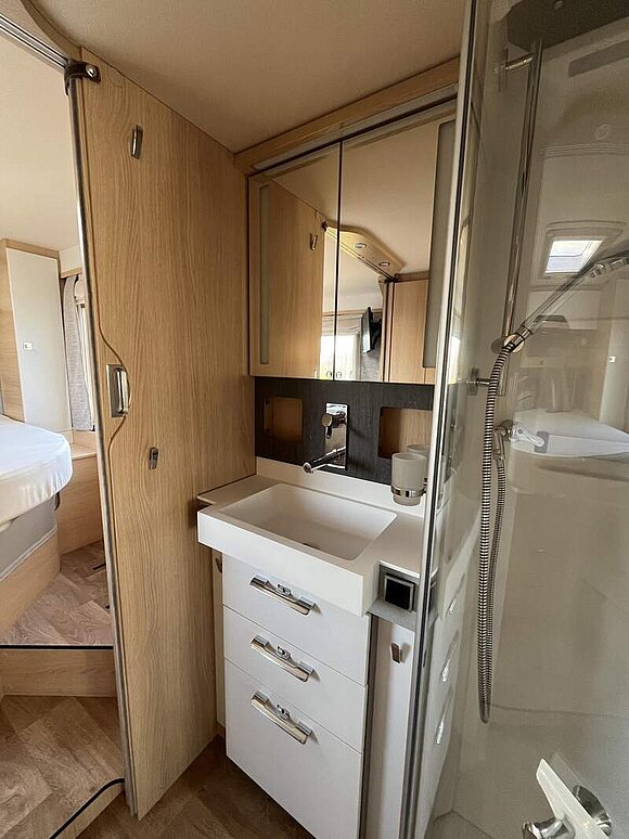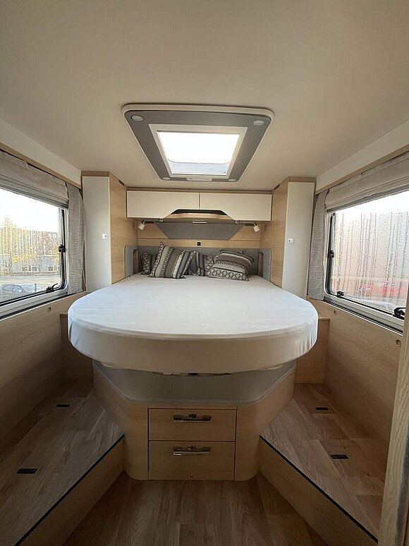 Wohnkomfort-Paket 3 (Einlegeboden mit Holzoberfläche, 4 x 230 V / 1 x 12 V / 1 x Doppel-USB Zusatzsteckdosen sowie Wohnkomfortleuchten, Spannbettlaken nach Maß für Heckbetten individuell an Matratzenkonturen angepasst, 4 Kissen mit Bezug)
