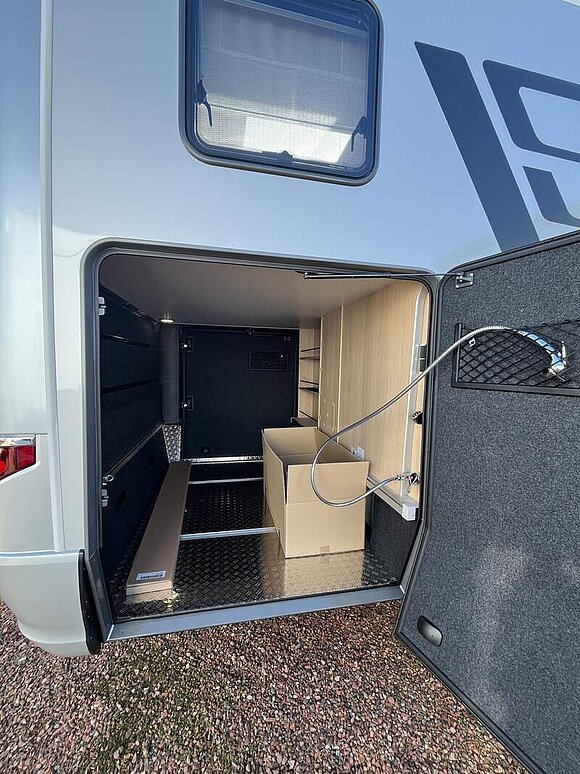 Riffelblechboden, Filzverkleidung und 2 zusätzliche Zurrschienen in Heckgarage