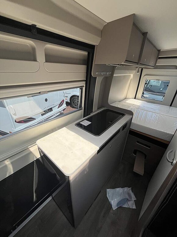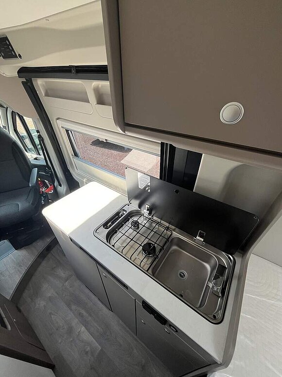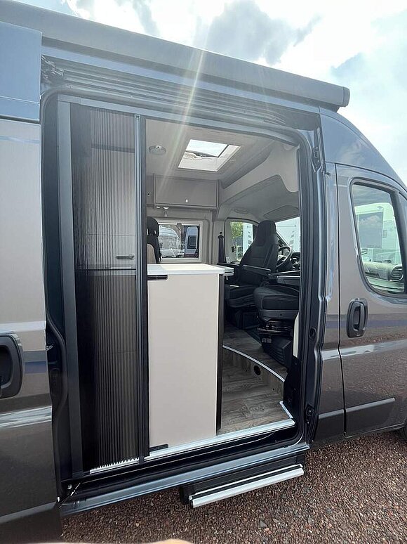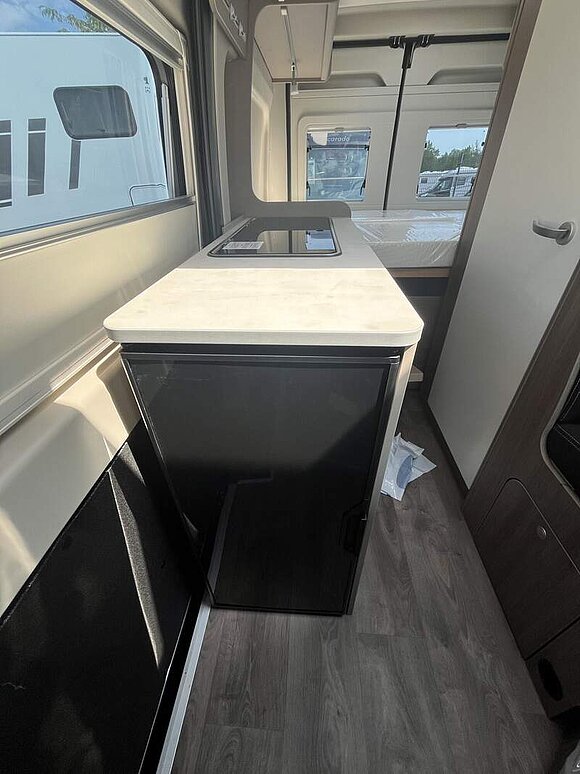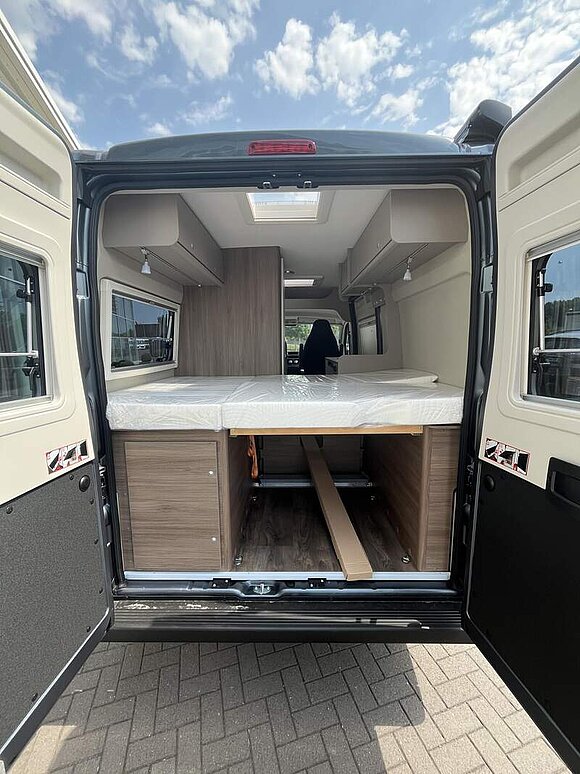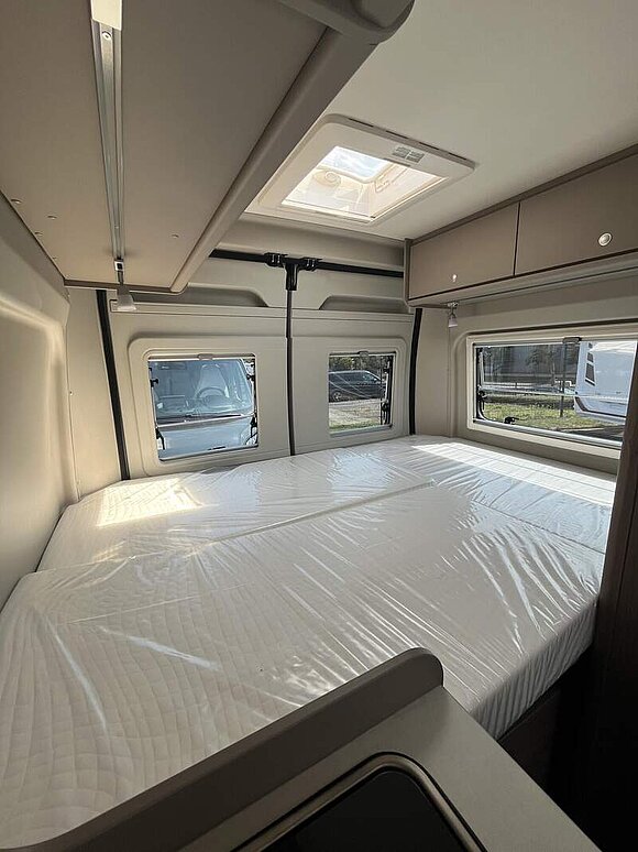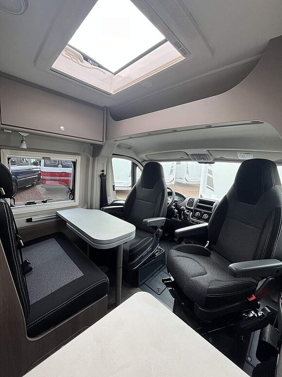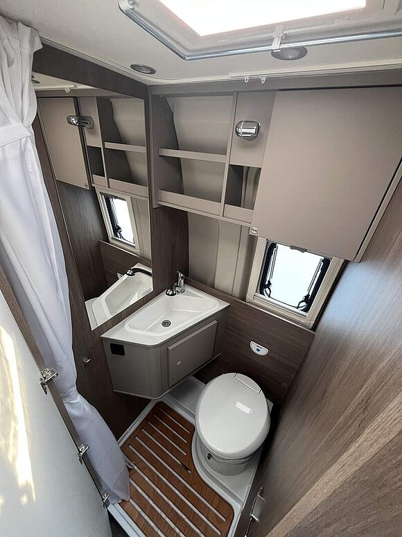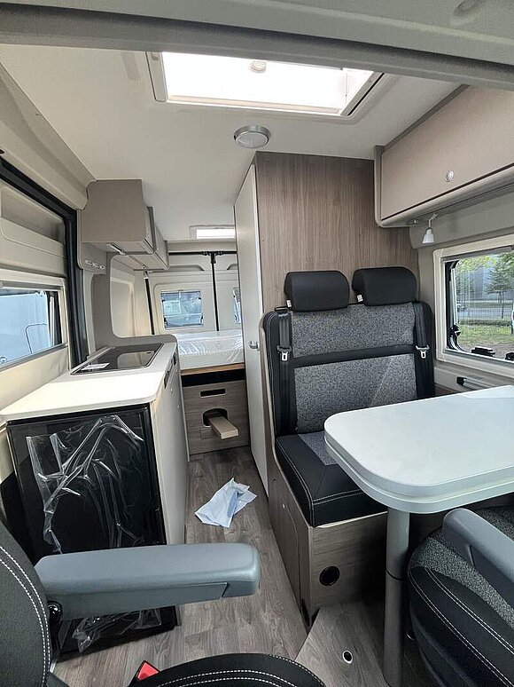 Basic Paket (Dachhaube Midi Heki 70 x 50 cm über Sitzgruppe, Duschausstattung, Fenster im Bad, Kleiderstange in der Nasszelle, Breite Einstiegsstufe, Drehplatte für Tischerweiterung an der Sitzgruppe)