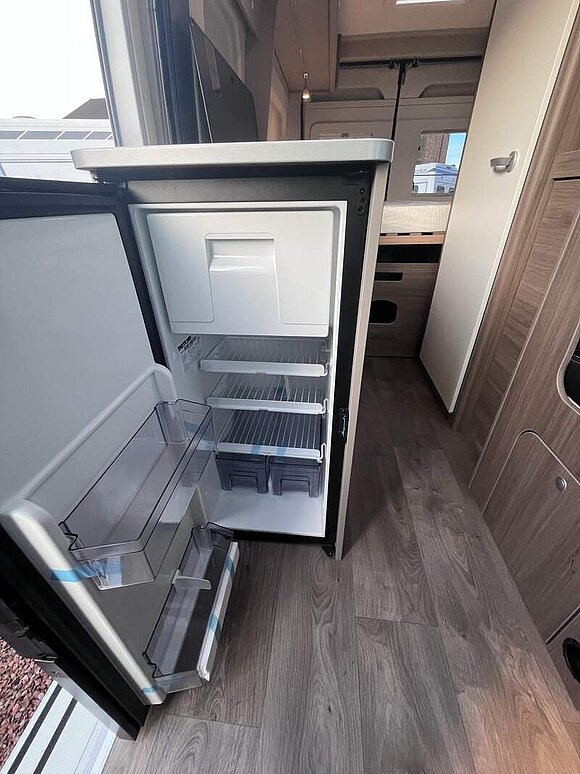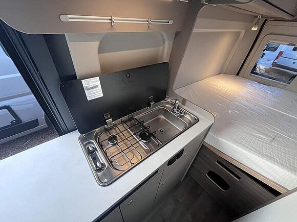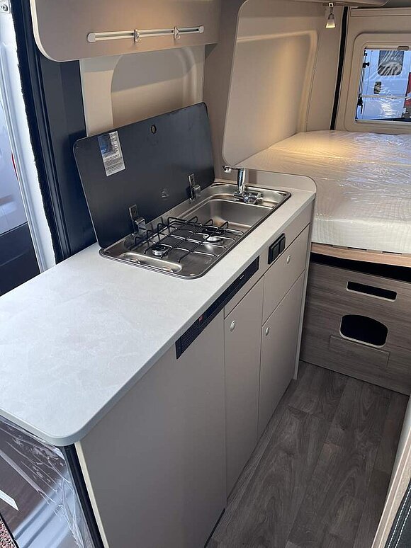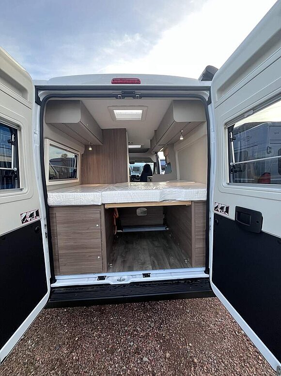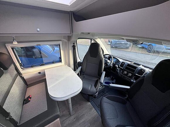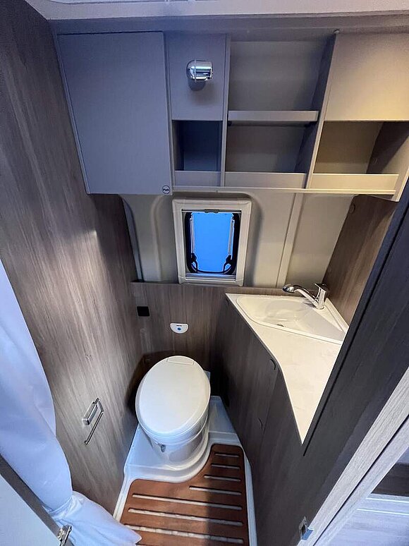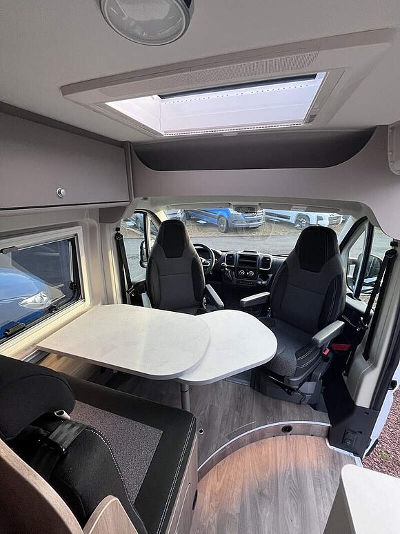 Basic Paket (Dachhaube Midi Heki 70 x 50 cm über Sitzgruppe, Duschausstattung, Fenster im Bad, Kleiderstange in der Nasszelle, Breite Einstiegsstufe, Drehplatte für Tischerweiterung an der Sitzgruppe)
