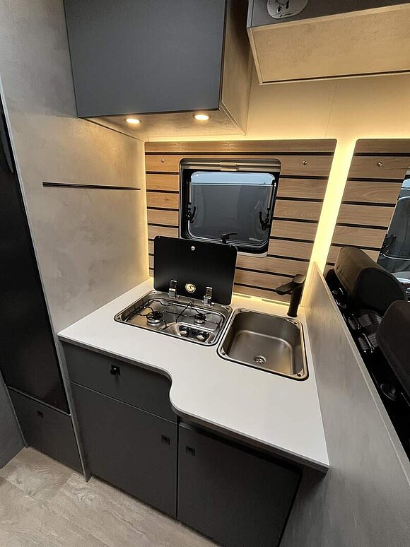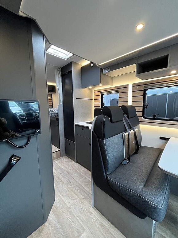 Base Kit (Verdunklungsjalousien im Fahrerhaus, Fliegengitter-Aufbautür, Isofix Kindersitzbefestigung für 3. und 4. Sitzplatz in Fahrtrichtung, Duschrost, Light Moments: Indirekte Ambientebeleuchtung über den Dachstauschränken, Light Moments: Küchenrückwand beleuchtet, Light Moments: Fensterverkleidung im Wohnraum beleuchtet)