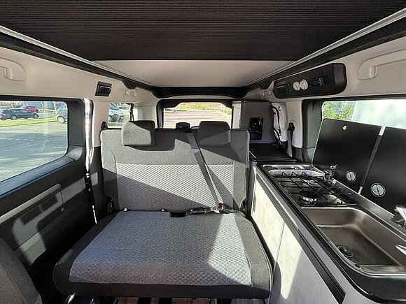 Camp Kit (Zusätzliche Digital-Steuerungsfunktionen inkl. Tablet (Steuerung von Ambientelicht, Standheizung und Batteriemanagement, Tankfüllstandsanzeigen), Standheizung inklusive Anbindung an Revotion (Smartphone) und Wandbedienpanel (Heizbedienpanel bleibt wegen Temperatursensor), Multifunktions-Campingtisch (in Küchenblock einhängbar, ebenso autark nutzbar), Flexboard, entnehmbar, Zwei Schwanenhalsleuchten im Aufstelldach mit USB-C Anschluss, Beleuchtete Heckklappe (Spot), Dimmbare Ambientbeleuchtung in Möbelbau, Kompressorkühlbox 36l fest verbaut in Heckschrank, Dachreling rechts und links, Außendusche (Schlauch, Brausekopf, Halter und Saugnapf))
