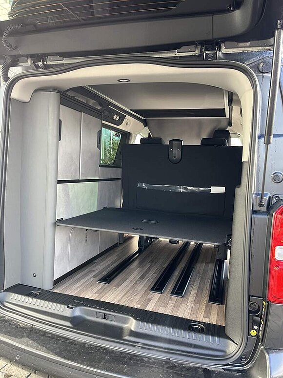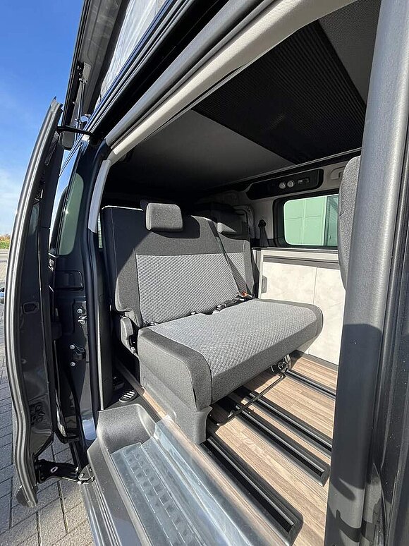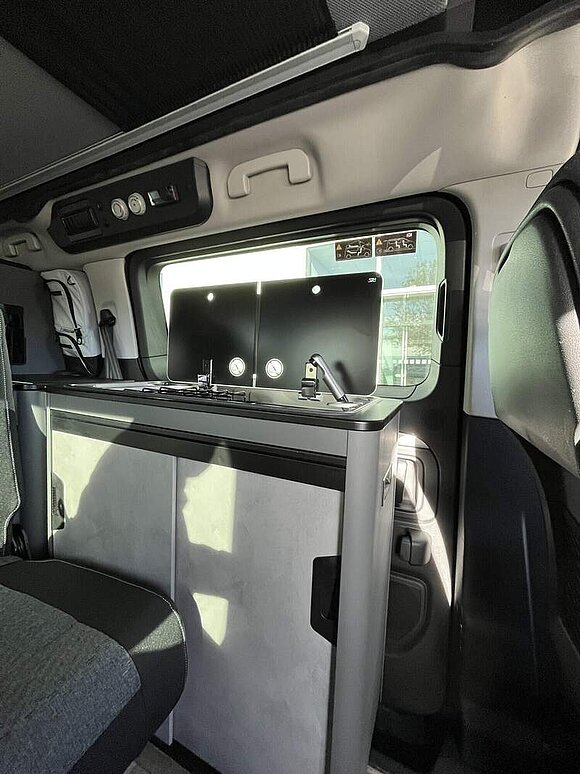 Camp Kit (Zusätzliche Digital-Steuerungsfunktionen inkl. Tablet (Steuerung von Ambientelicht, Standheizung und Batteriemanagement, Tankfüllstandsanzeigen), Standheizung inklusive Anbindung an Revotion (Smartphone) und Wandbedienpanel (Heizbedienpanel bleibt wegen Temperatursensor), Multifunktions-Campingtisch (in Küchenblock einhängbar, ebenso autark nutzbar), Flexboard, entnehmbar, Zwei Schwanenhalsleuchten im Aufstelldach mit USB-C Anschluss, Beleuchtete Heckklappe (Spot), Dimmbare Ambientbeleuchtung in Möbelbau, Kompressorkühlbox 36l fest verbaut in Heckschrank, Dachreling rechts und links, Außendusche (Schlauch, Brausekopf, Halter und Saugnapf))