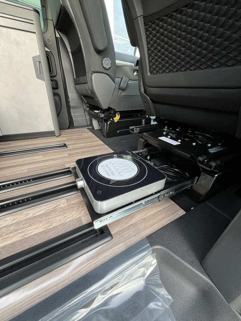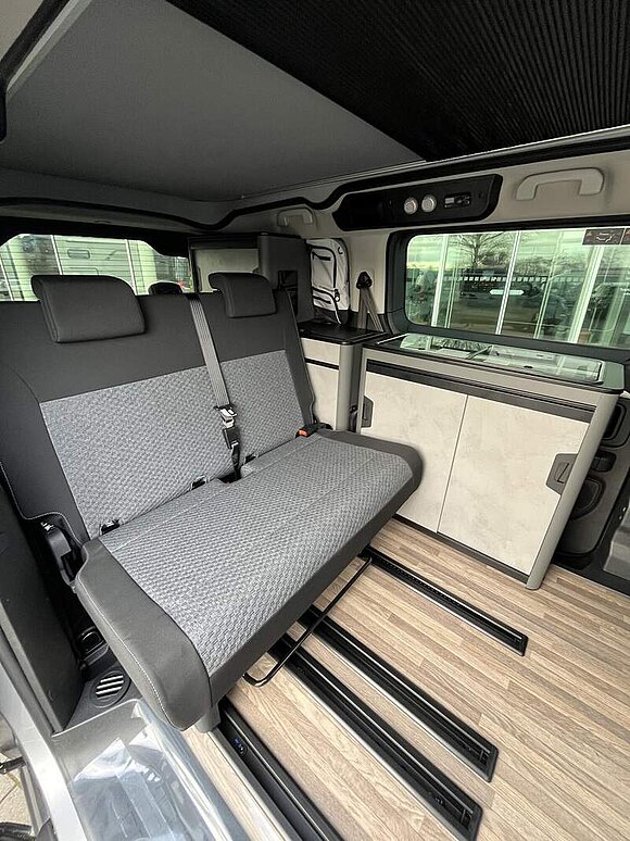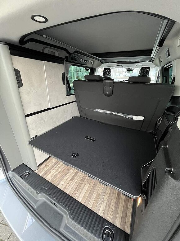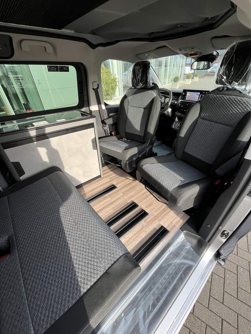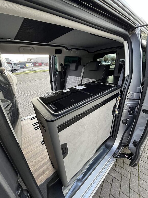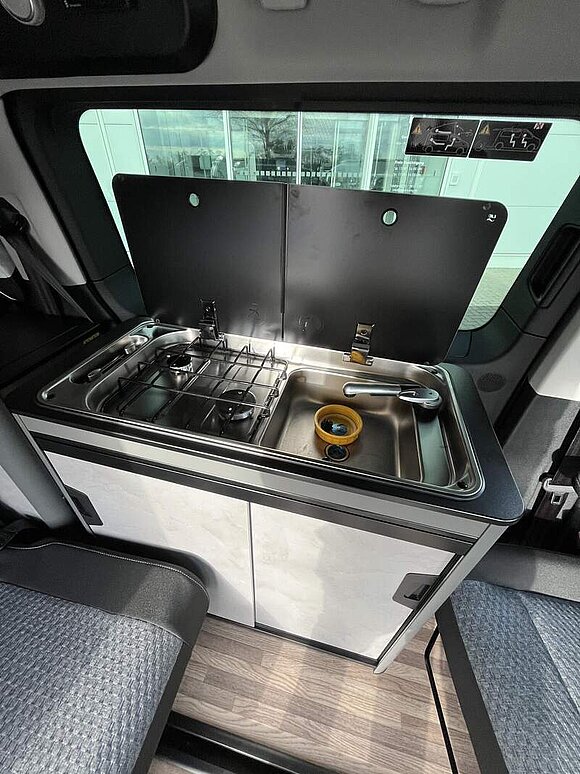 Camp Kit (Zusätzliche Digital-Steuerungsfunktionen inkl. Tablet (Steuerung von Ambientelicht, Standheizung und Batteriemanagement, Tankfüllstandsanzeigen), Standheizung inklusive Anbindung an Revotion (Smartphone) und Wandbedienpanel (Heizbedienpanel bleibt wegen Temperatursensor), Multifunktions-Campingtisch (in Küchenblock einhängbar, ebenso autark nutzbar), Flexboard, entnehmbar, Zwei Schwanenhalsleuchten im Aufstelldach mit USB-C Anschluss, Beleuchtete Heckklappe (Spot), Dimmbare Ambientbeleuchtung in Möbelbau, Kompressorkühlbox 36l fest verbaut in Heckschrank, Dachreling rechts und links, Außendusche (Schlauch, Brausekopf, Halter und Saugnapf))