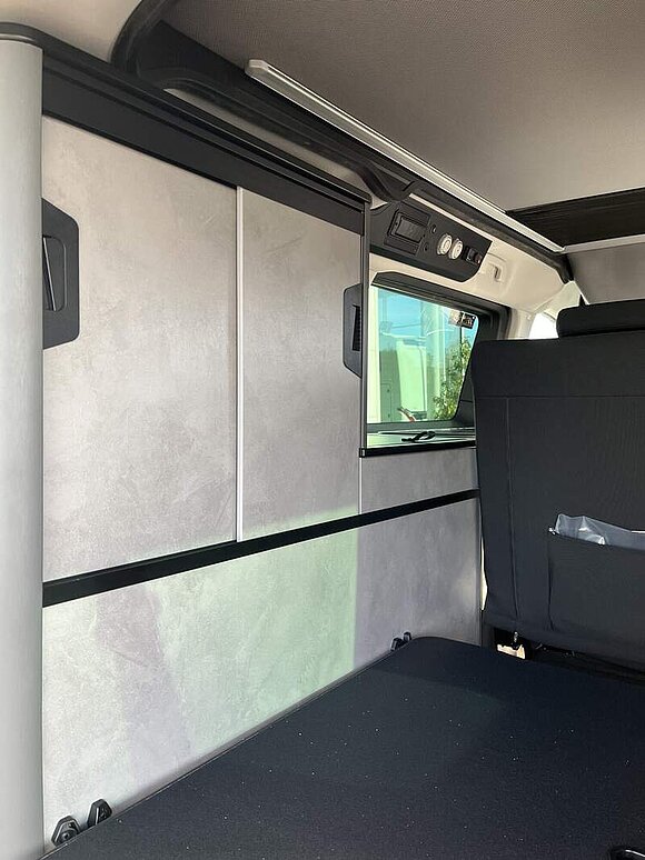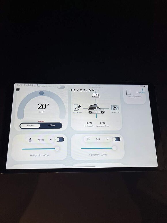 Camp Kit (Zusätzliche Digital-Steuerungsfunktionen inkl. Tablet (Steuerung von Ambientelicht, Standheizung und Batteriemanagement, Tankfüllstandsanzeigen), Standheizung inklusive Anbindung an Revotion (Smartphone) und Wandbedienpanel (Heizbedienpanel bleibt wegen Temperatursensor), Multifunktions-Campingtisch (in Küchenblock einhängbar, ebenso autark nutzbar), Flexboard, entnehmbar, Zwei Schwanenhalsleuchten im Aufstelldach mit USB-C Anschluss, Beleuchtete Heckklappe (Spot), Dimmbare Ambientbeleuchtung in Möbelbau, Kompressorkühlbox 36l fest verbaut in Heckschrank, Dachreling rechts und links, Außendusche (Schlauch, Brausekopf, Halter und Saugnapf))