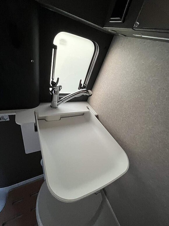 Ausstellfenster im Heck in Fahrtrichtung links inkl. Verdunkelungsrollo und Mückenschutz