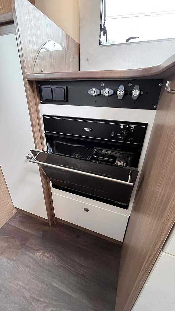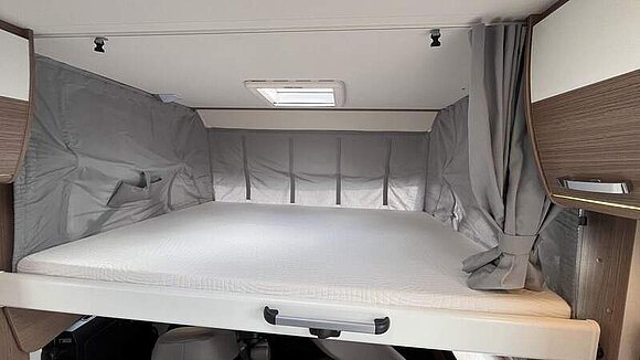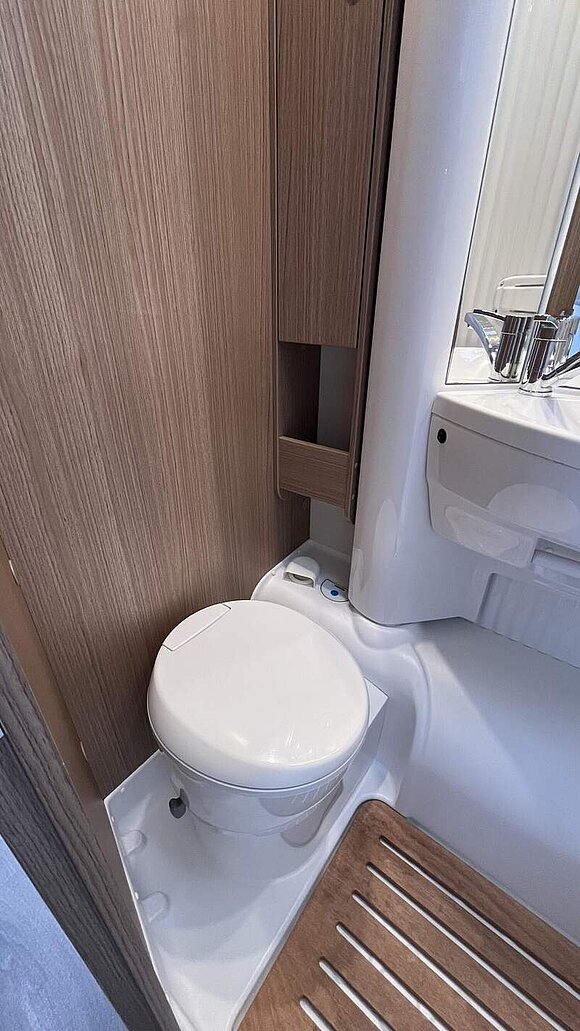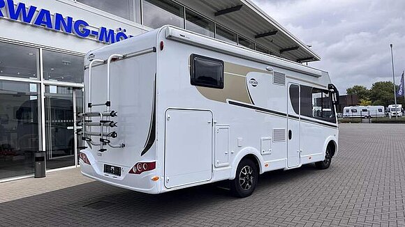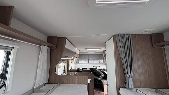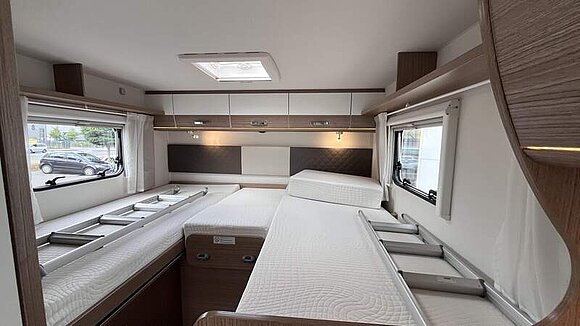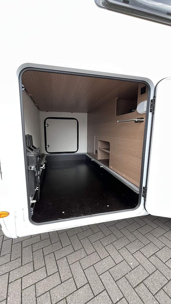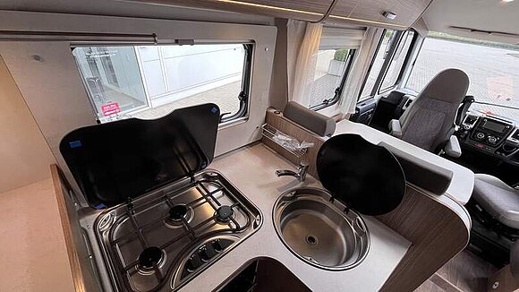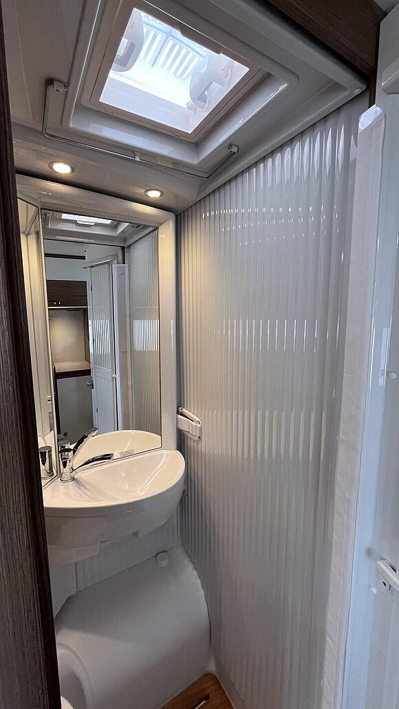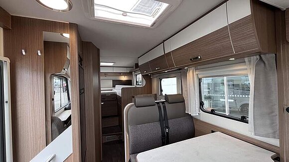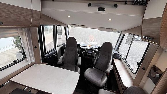 Basic-Paket I (Panoramadachhaube über Sitzgruppe, Klarglasdachhaube 40x40, Duschraumverkleidung, Spiegel mit indirekter Beleuchtung und Garderobenhaken, Holzlattenrost in der Dusche, Pilotensitze inkl. Wohnraumbezüge 9), zusätzl. Steckdose im Dachschrank über dem Küchenblock, Steckdose in der Garage, Fahrerhaustüre links, zus. Klarglas-Dachhaube 40x40 über dem Hubbett)