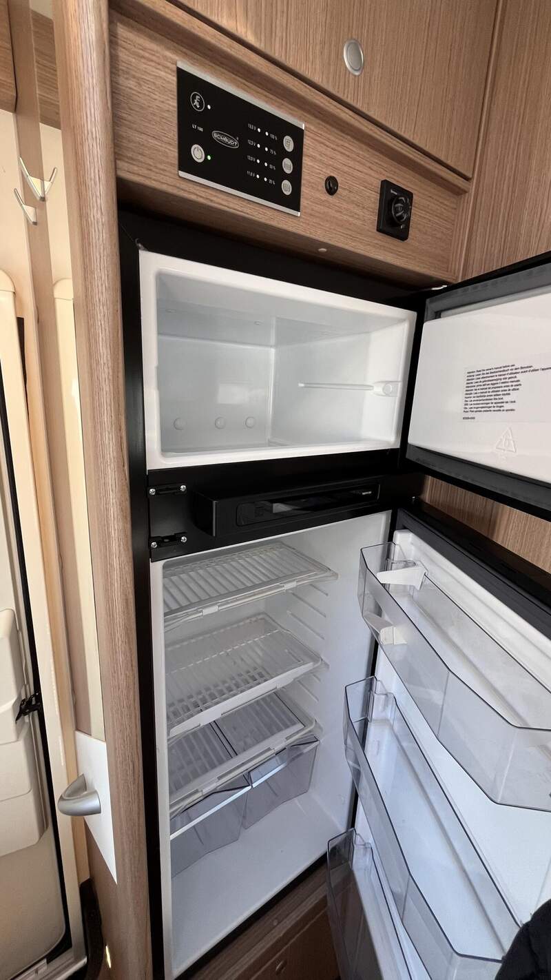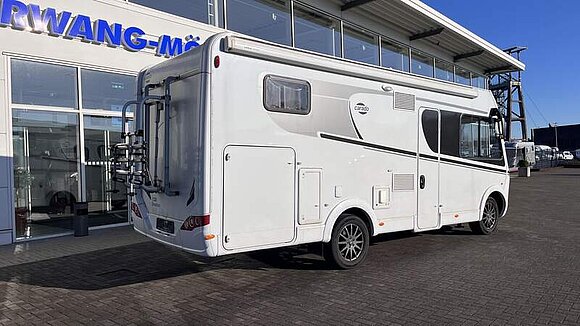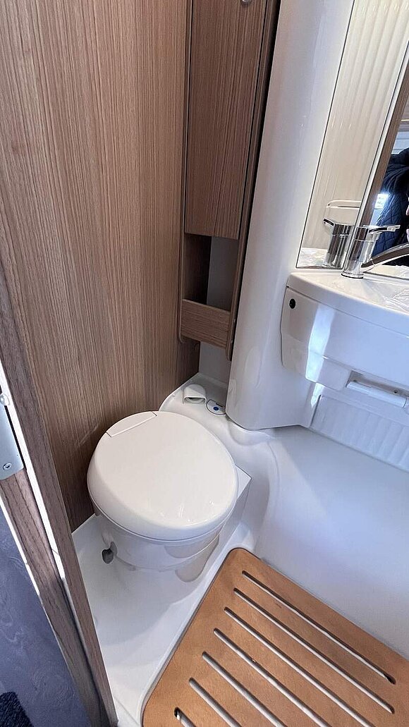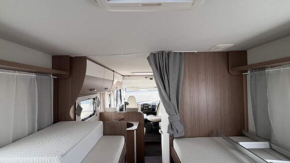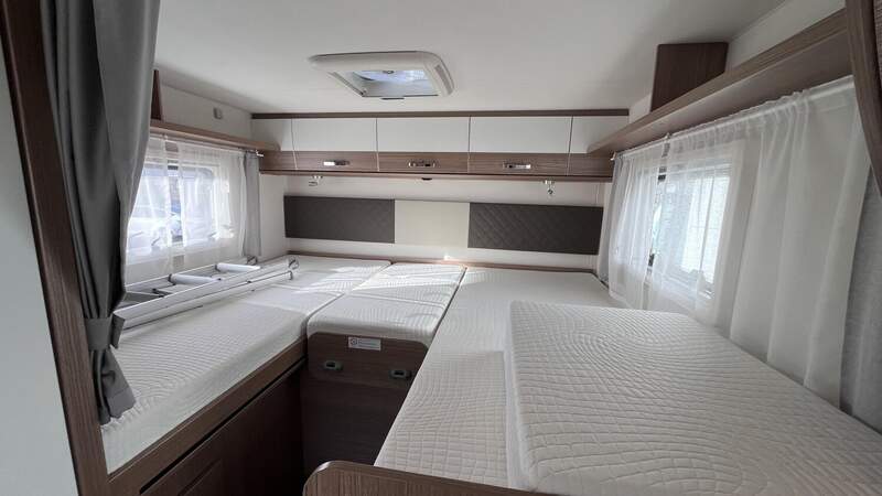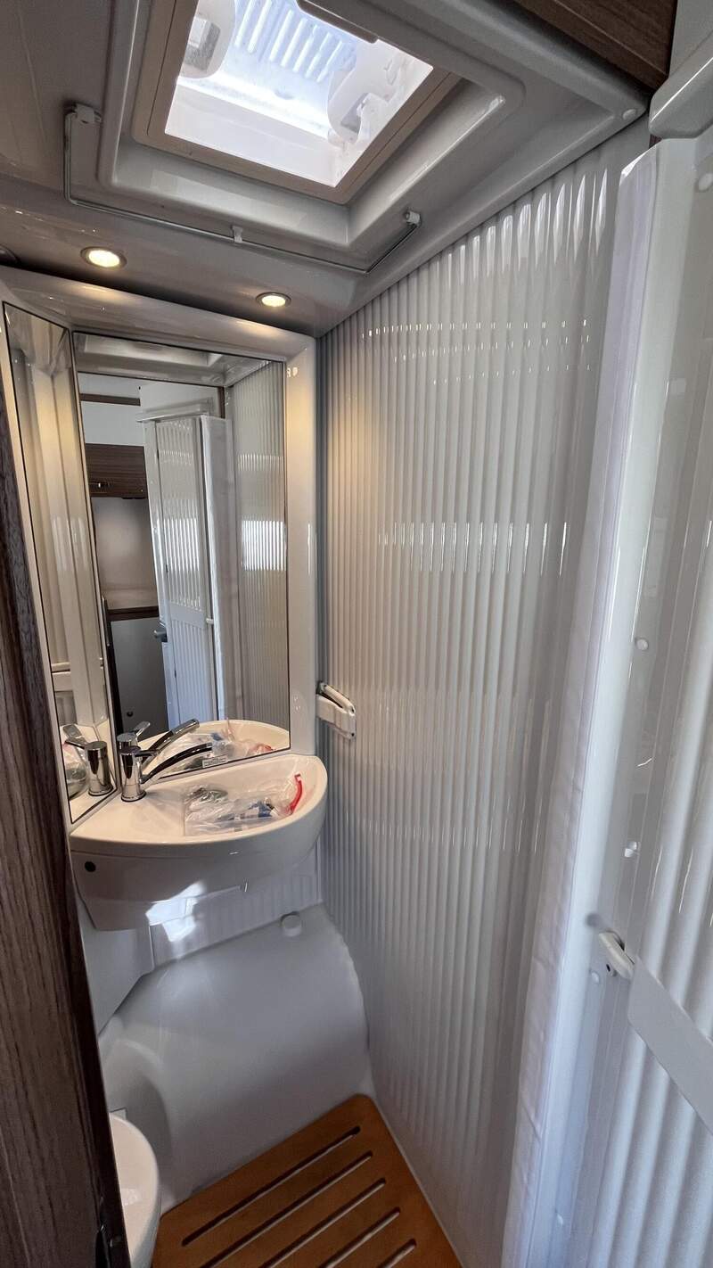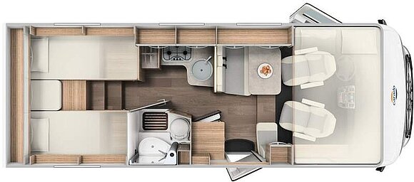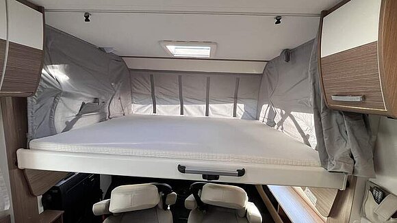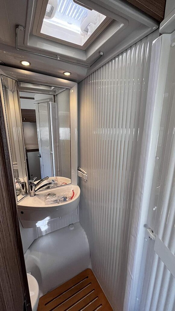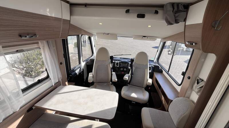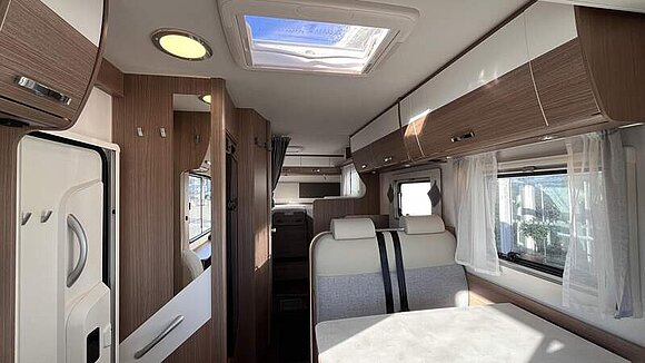 Basic-Paket I (Panoramadachhaube über Sitzgruppe, Klarglasdachhaube 40x40, Duschraumverkleidung, Spiegel mit indirekter Beleuchtung und Garderobenhaken, Holzlattenrost in der Dusche, Pilotensitze inkl. Wohnraumbezüge 9), zusätzl. Steckdose im Dachschrank über dem Küchenblock, Steckdose in der Garage, Fahrerhaustüre links, zus. Klarglas-Dachhaube 40x40 über dem Hubbett)