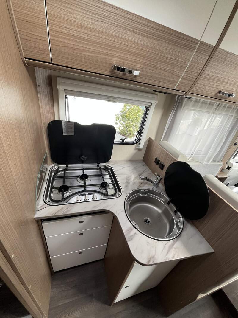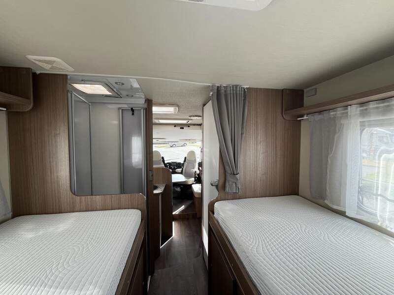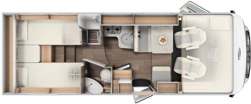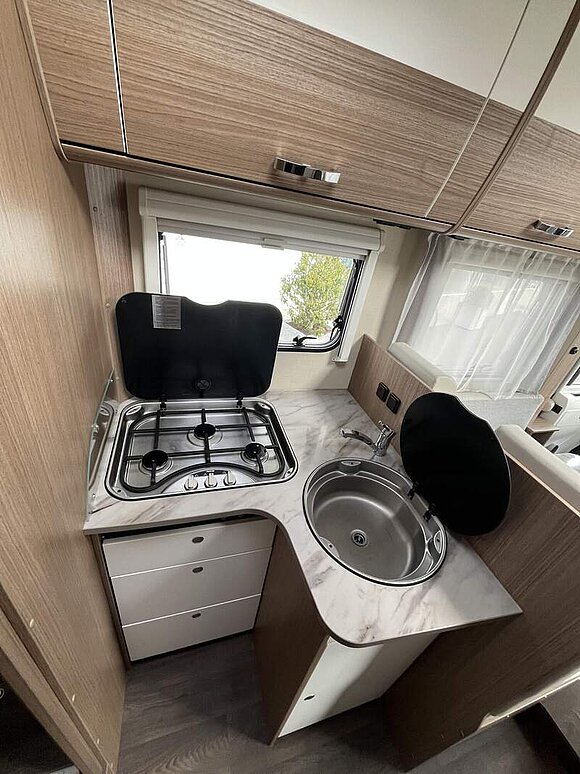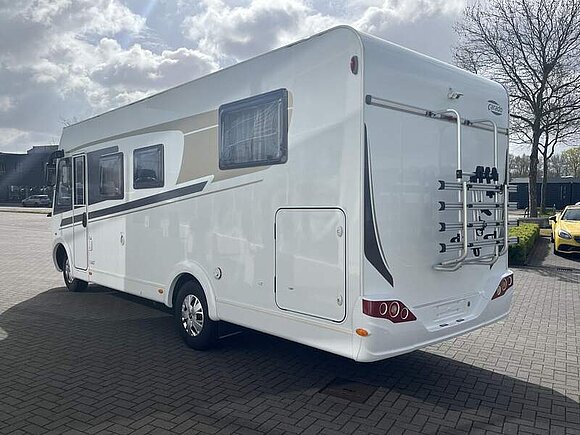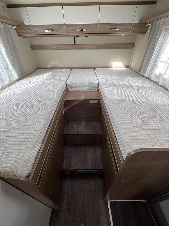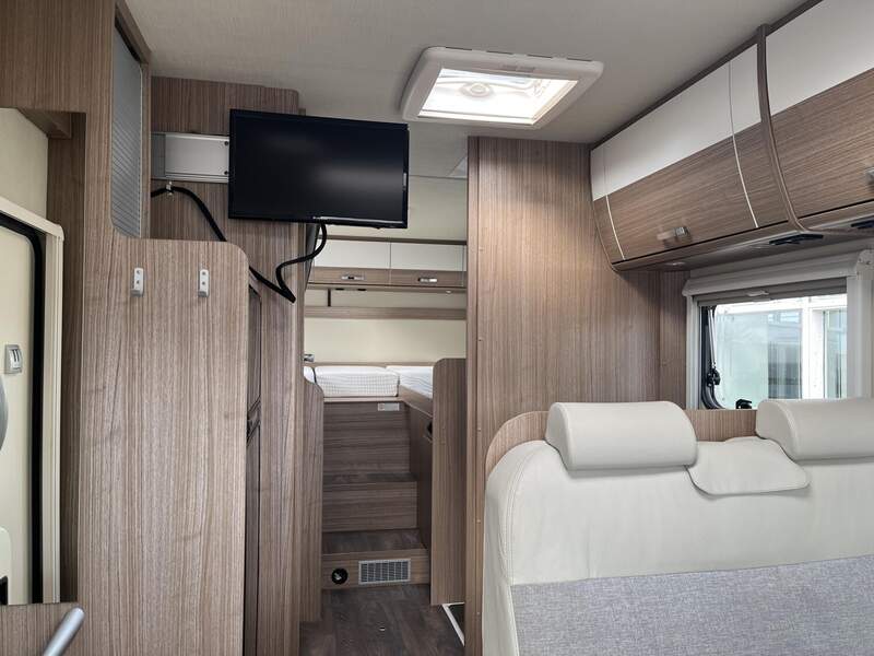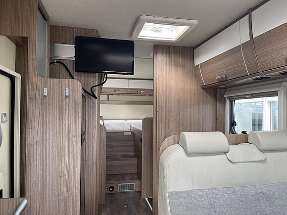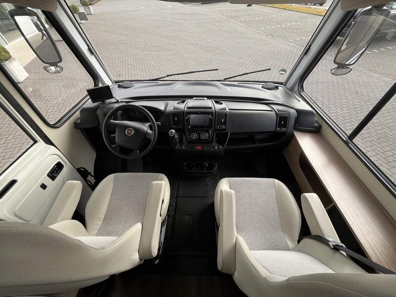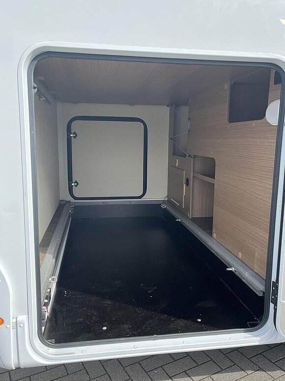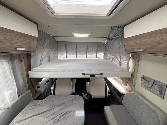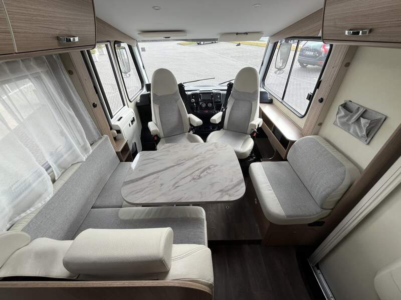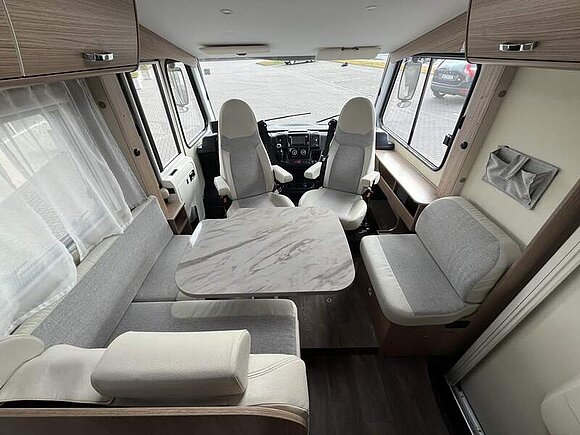 Basic-Paket I (Panoramadachhaube über Sitzgruppe, Klarglas-Dachhaube 40x40, Duschraumverkleidung, Spiegel mit Garderobenhaken, Holzlattenrost in der Dusche, Pilotensitze inkl. Wohnraumbezüge 5), LED Wohnraumleuchte, zusätzl. Steckdose im Dachschrank über dem Küchenblock, Kleiderstange in der Naßzelle, Steckdose in der Garage, Fahrerhaustüre links, zus. Klarglas-Dachhaube 40x40 über dem Hubbett)
