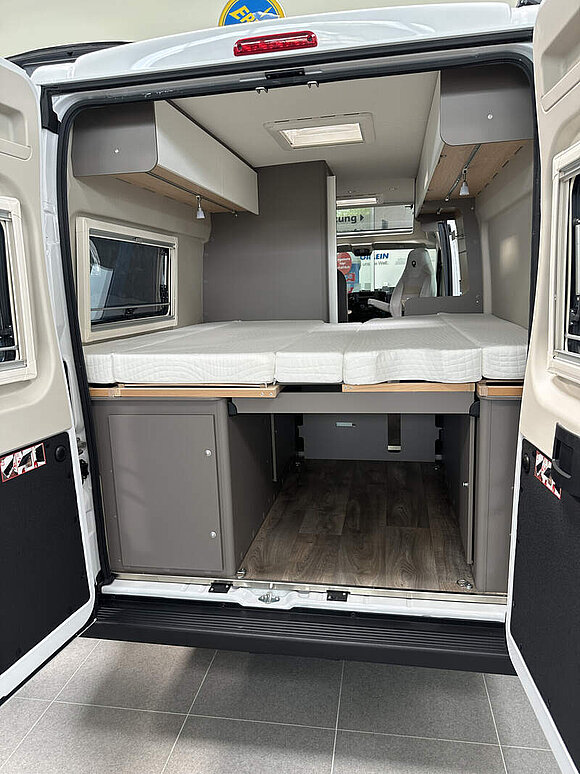 Heck Edition Paket: Markise, Elektrische Einstiegstufe Omnistep, Fliegengittertür, Kleiderstange in Nasszelle, Beklebung, Bestickung der Kopfstützen)