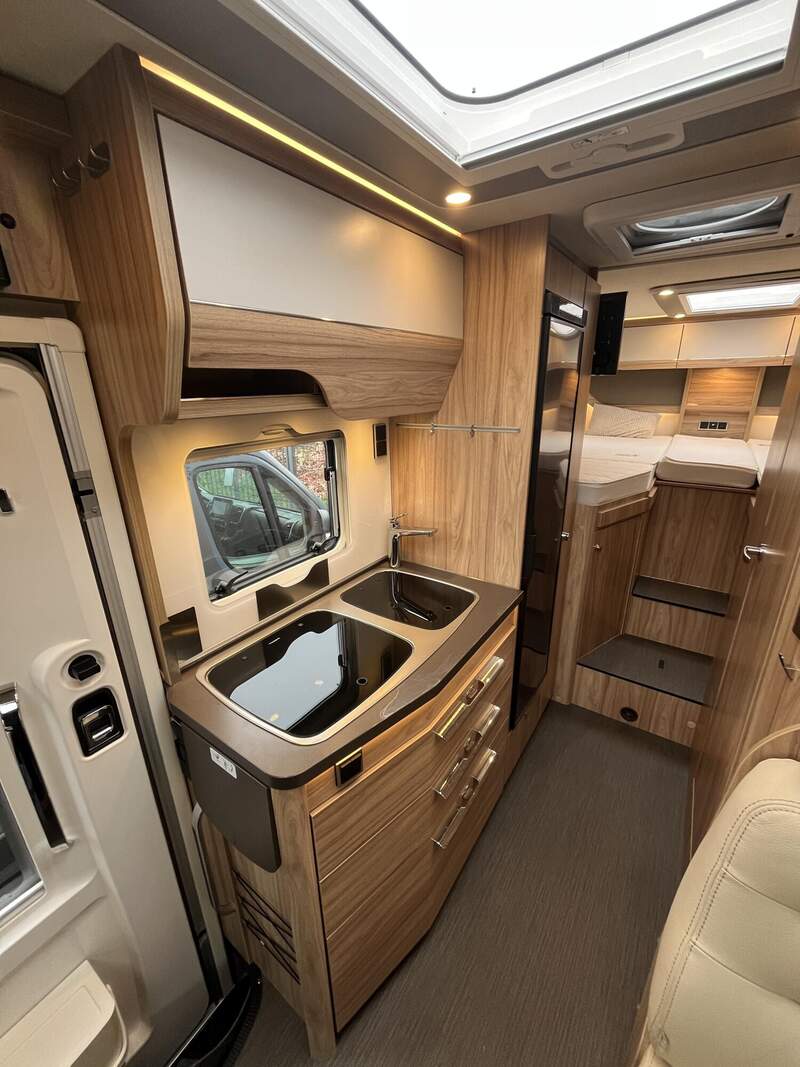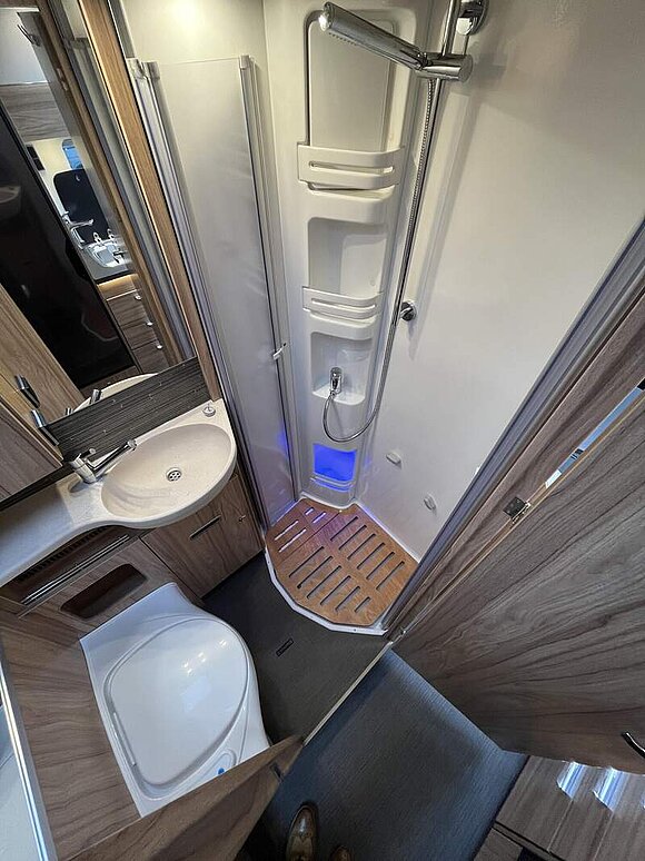 Wohnkomfort-Paket 4 (Einlegeboden mit Holzoberfläche, Spannbettlaken nach Maß für Heckbetten individuell an Matratzenkonturen angepasst, 4 Kissen mit Bezug, Ambiente-Beleuchtung, 4 x 230 V / 1 x 12 V / 2 x Doppel-USB (USB-A/C) Zusatzsteckdosen (inkl. Küchenwand-Verkleidung))