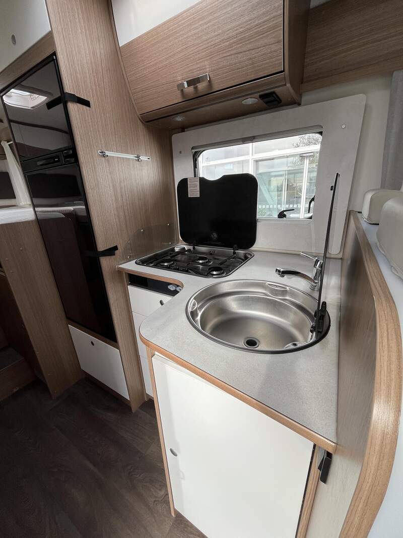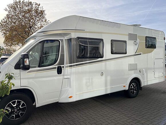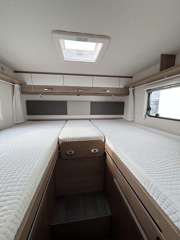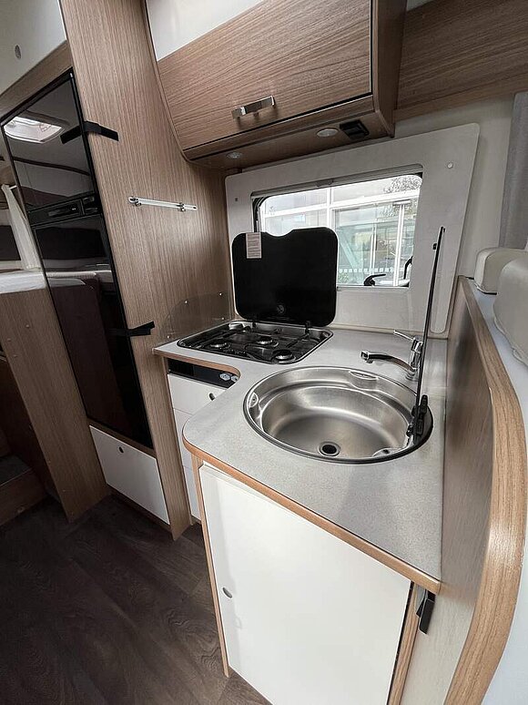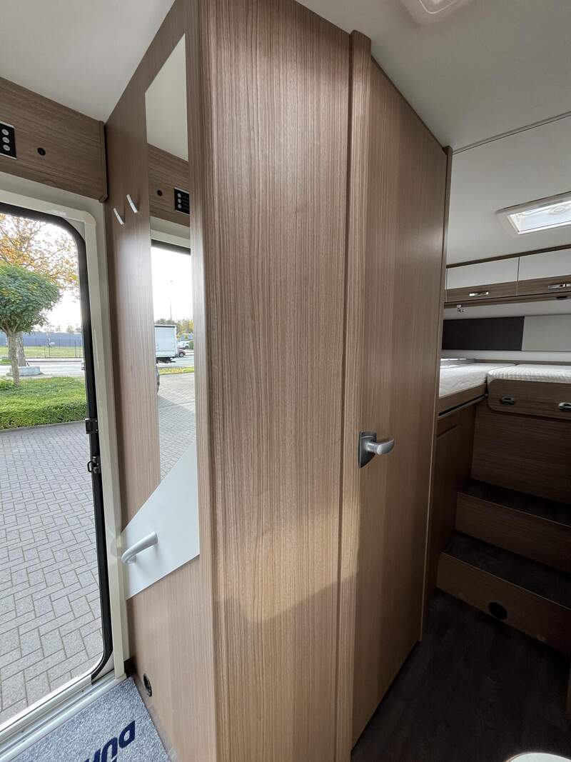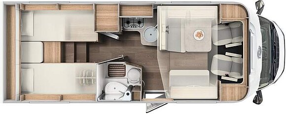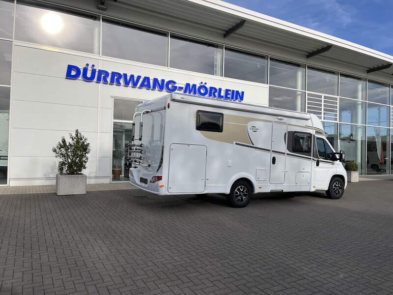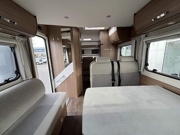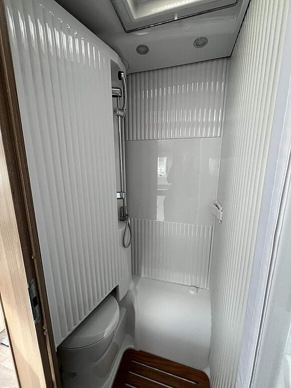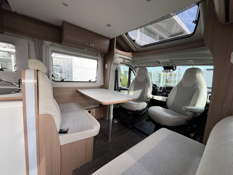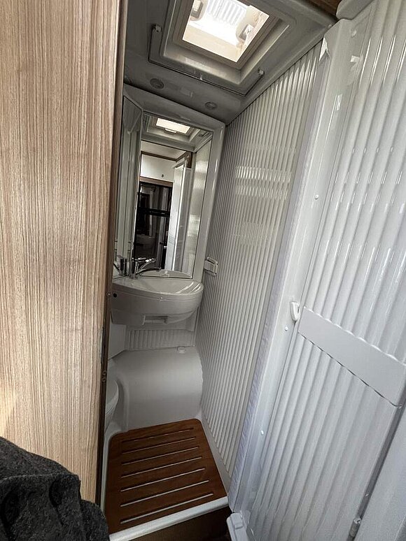 Basic-Paket T/A (Panoramadachhaube über Küche 7), Klarglasdachhaube 40x40, Duschraumverkleidung, Spiegel mit indirekter Beleuchtung und Garderobenhaken 8), Holzlattenrost in der Dusche, Captain Chair mit Bezügen 9), zusätzl. Steckdose im Dachschrank über dem Küchenblock, Steckdose in der Garage)