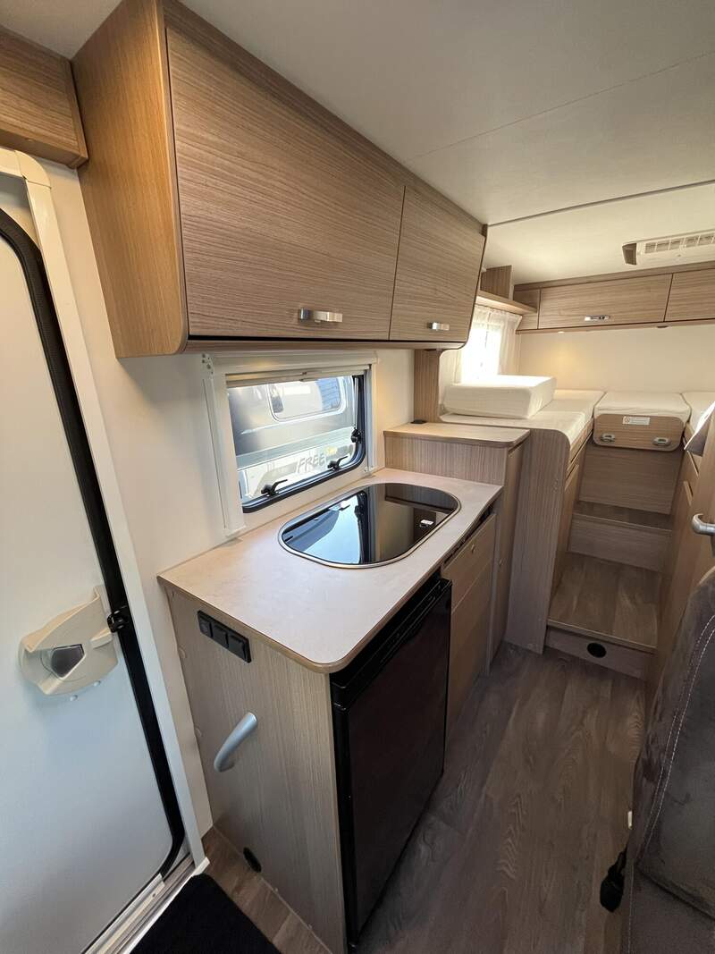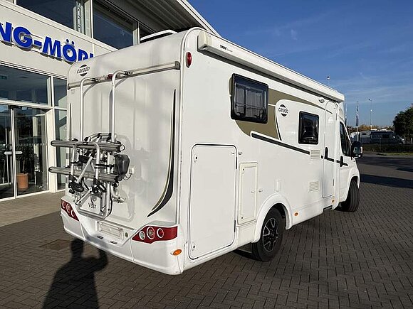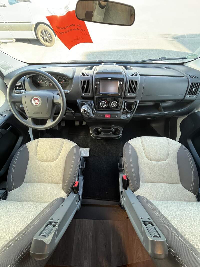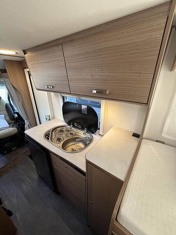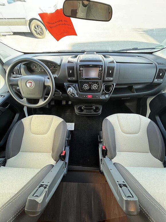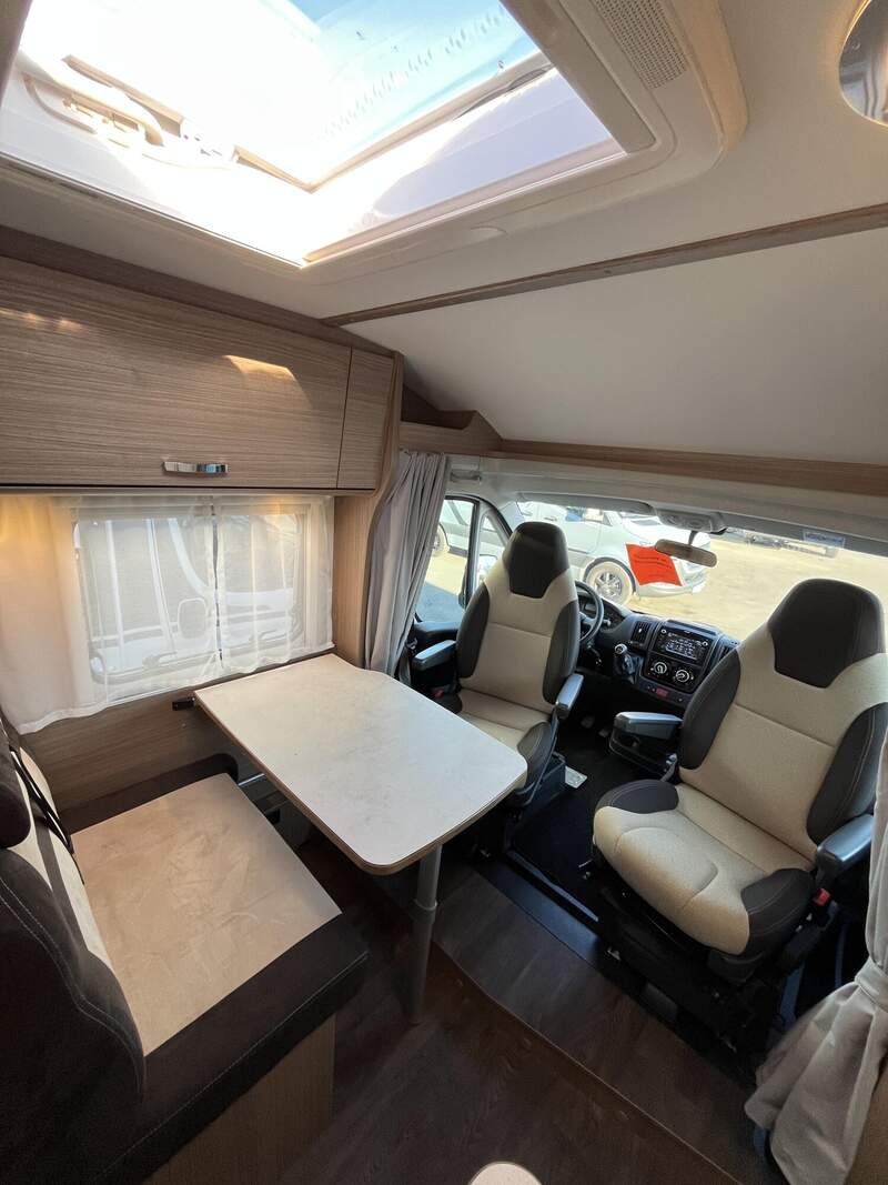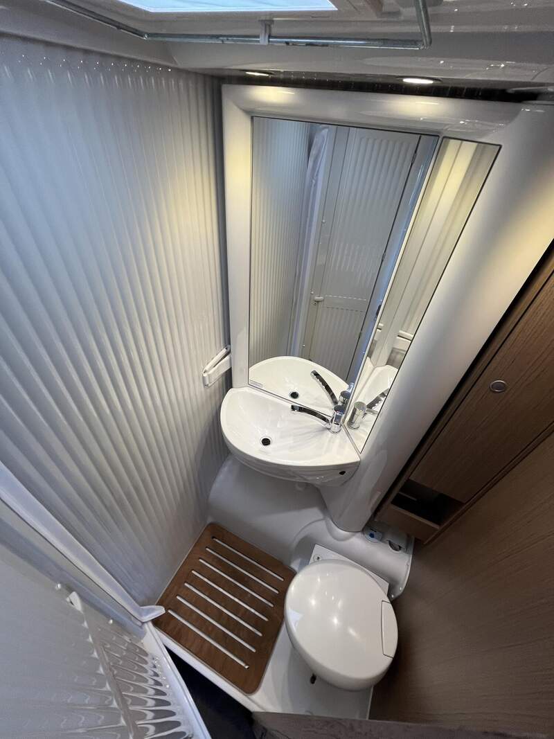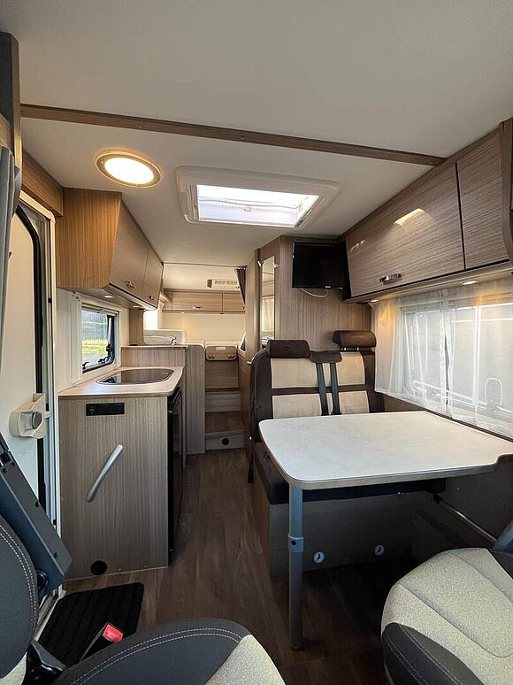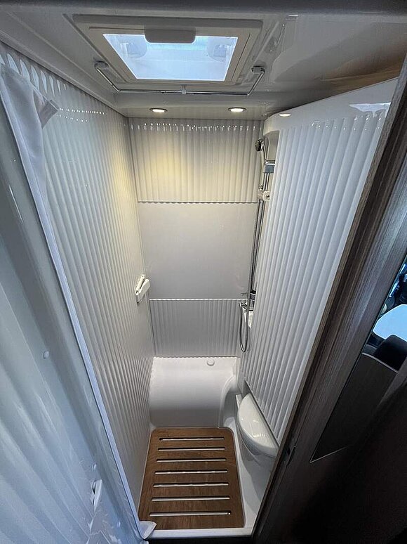 Basic-Paket (Panoramadachhaube über Sitzgruppe, Klarglas-Dachhaube 40x40, Duschraumverkleidung, Spiegel mit Garderobenhaken, Holzlattenrost in der Dusche, Captain Chair mit Bezügen, zusätzl. Steckdose im Dachschrank über dem Küchenblock, Steckdose in der Garage)