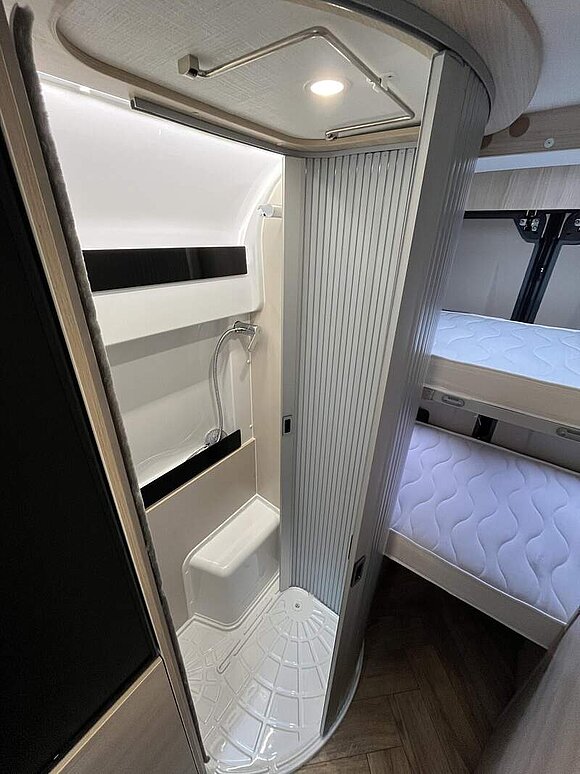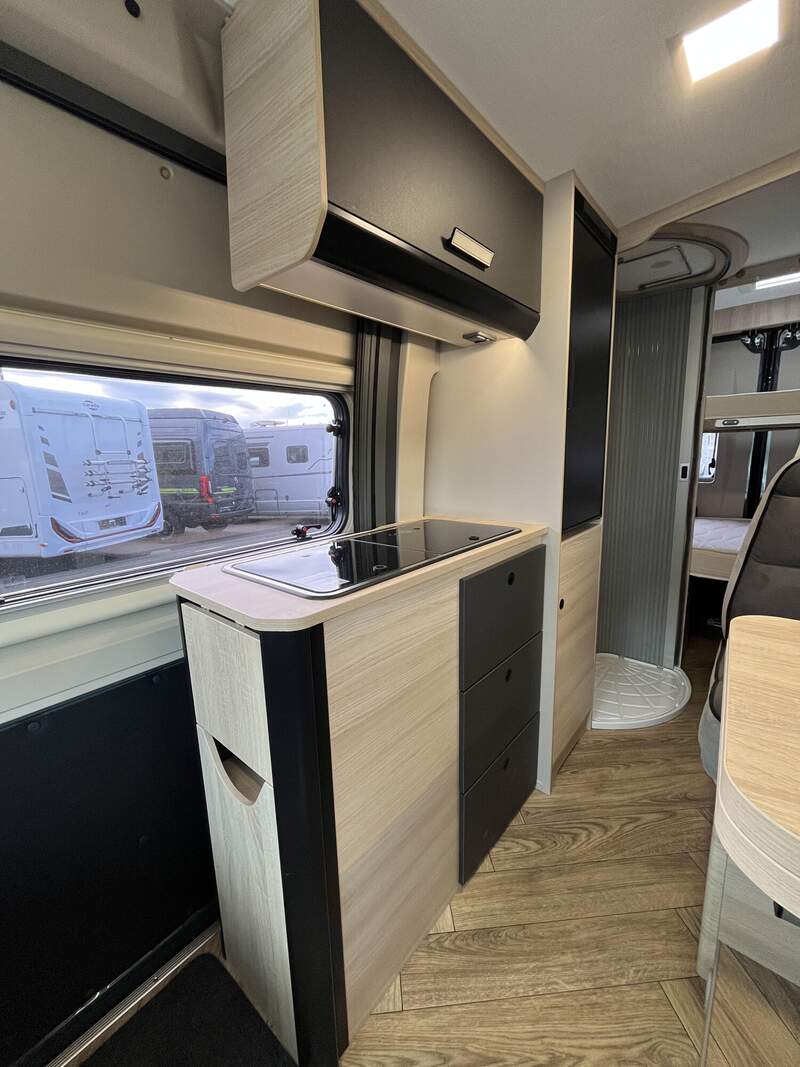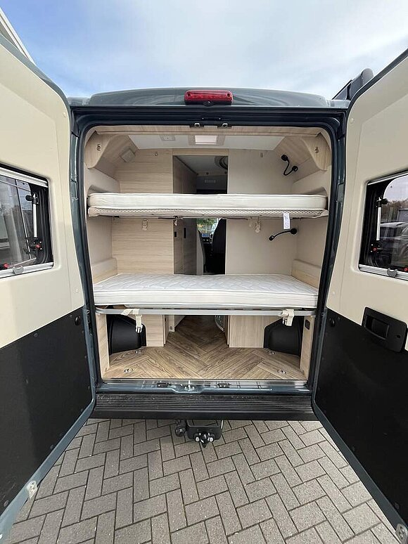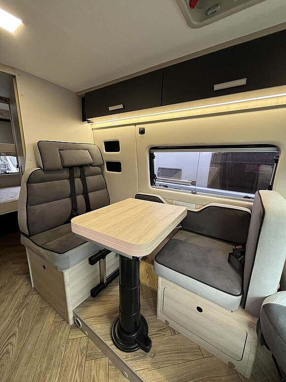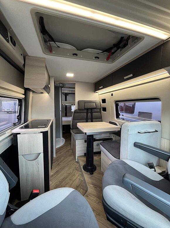 Serienausstattung Van Line (Ausstellfenster am Heck, ECO Paket: Start/Stop-System inkl. smarter Lichtmaschine, ESP, Elektrische Rückspiegel mit Abtau-Automatik, Elektrische Trittstufe, Erweiterung für Esstisch, Fahrer- und Beifahrerairbag, Fenster - Doppelverglasung mit Kombirollos, Fix and Go, Hill Descent control, Höhenverstellbare Drehsitze mit zwei Armlehnen, Klimaanlage Fahrerhaus manuell, TV-Vorbereitung, Tempomat + Geschwindigkeitsbegrenzer, Traction +, USB-Anschluss/USB-C, Vorbereitung Solarpanel, Vorverkabelung Rückfahrkamera, Waschraum mit Fenster, 16? Alufelgen schwarz, Dieselheizung während der Fahrt benutzbar, Nebelscheinwerfer, Schonbezüge für Fahrerhaussitze, Stoßstange in Wagenfarbe lackiert, offenes Fahrerhaus, verstärkte Isolierung "VPS", Lanzarote-grau, Pop-up)