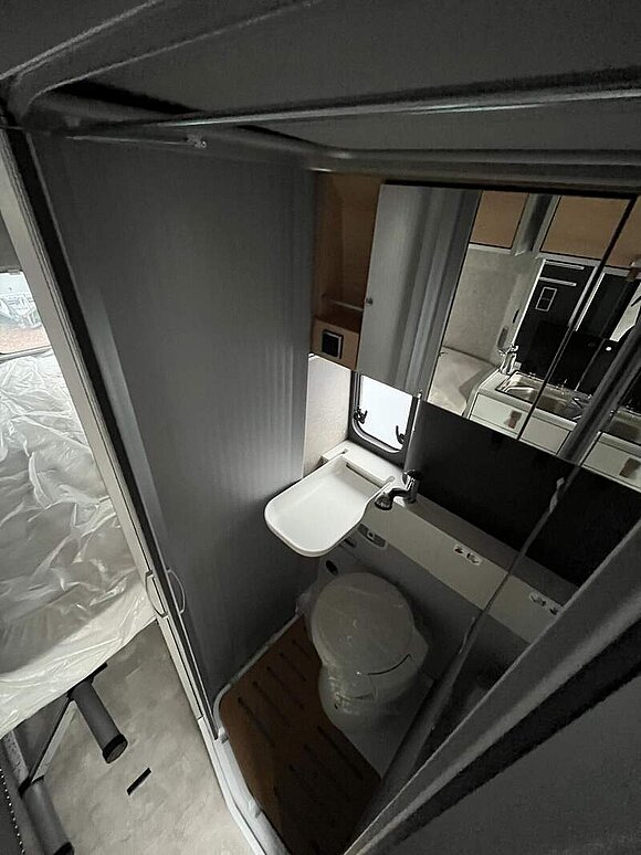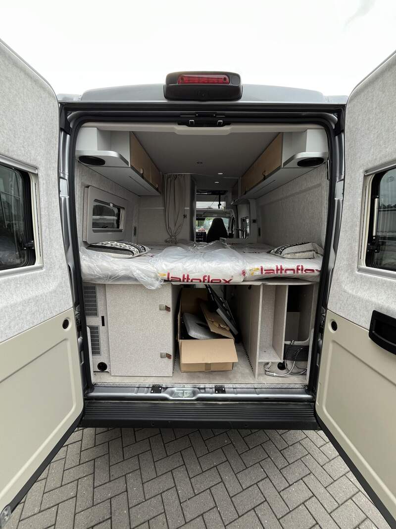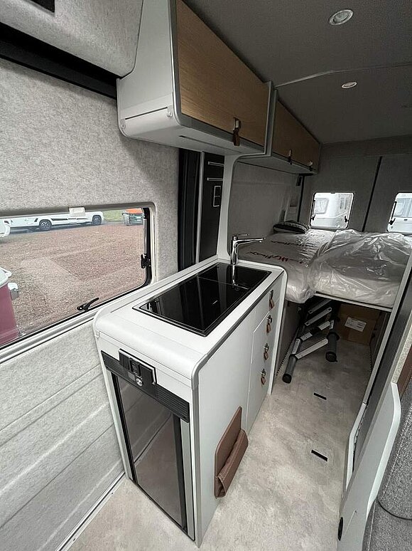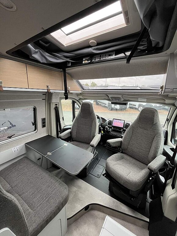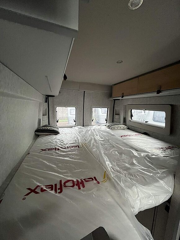 Wohnkomfort Paket (Skyview Fenster Fahrerhaus inkl. Verdunklung, Ambient-Light-System: Mehr-Ebenen Lichtsystem mit dynamischer und individueller Steuerung der Beleuchtung (inkl. Lichttemperatur) sowie stimmungsvoller Sockelbeleuchtung, Wohnwelt "HOME" (2 Kissen und Stofftasche), Spannbettlaken nach Maß für Heckbetten individuell an Matratzen angepasst, Einlegeboden mit Korkoberfläche)