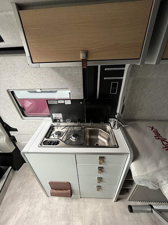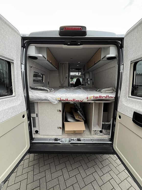 Ausstellfenster im Heck in Fahrtrichtung links inkl. Verdunkelungsrollo und Mückenschutz