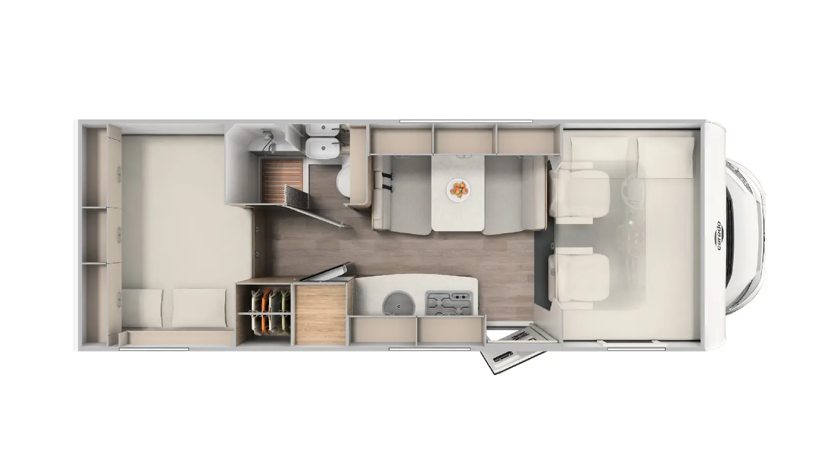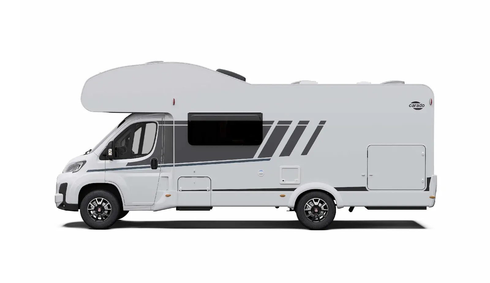 Der Carado V 337 bietet bis zu 4 Sitz- und Schlafplätze. Das Fahrzeug verfügt über ein Doppelbett im Heck und eine umklappbare Sitzgruppe im Wohnbereich, die als weiteres Schlafbett genutzt werden kann.
