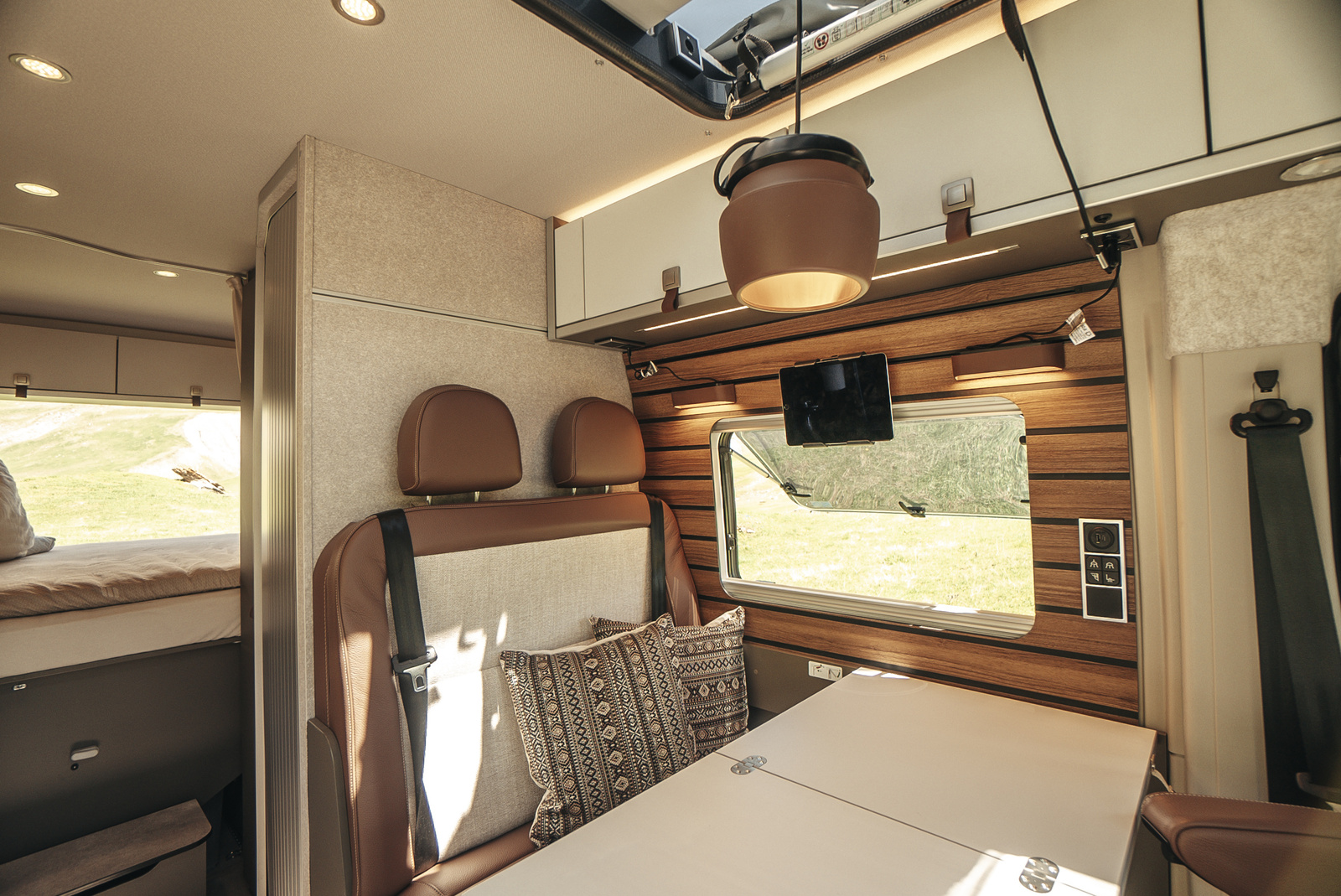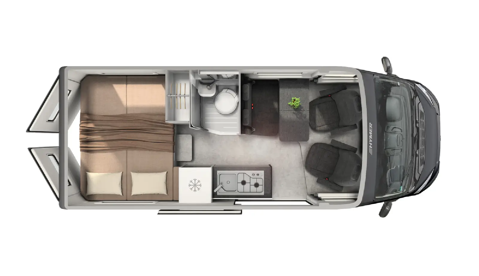 Der Innenraum des Hymer Redwood 600 ist auf effiziente Nutzung ausgelegt: Das Fahrzeug verfügt über große Staufächer, einen variablen Heckstauraum für Gepäck oder Sportequipment, eine drehbare Sitzgruppe und eine gut zugängliche Küche. Auch bei längeren Aufenthalten sorgt die durchdachte Raumaufteilung für angenehme Bewegungsfreiheit und einen reibungslosen Ablauf im täglichen Gebrauch.