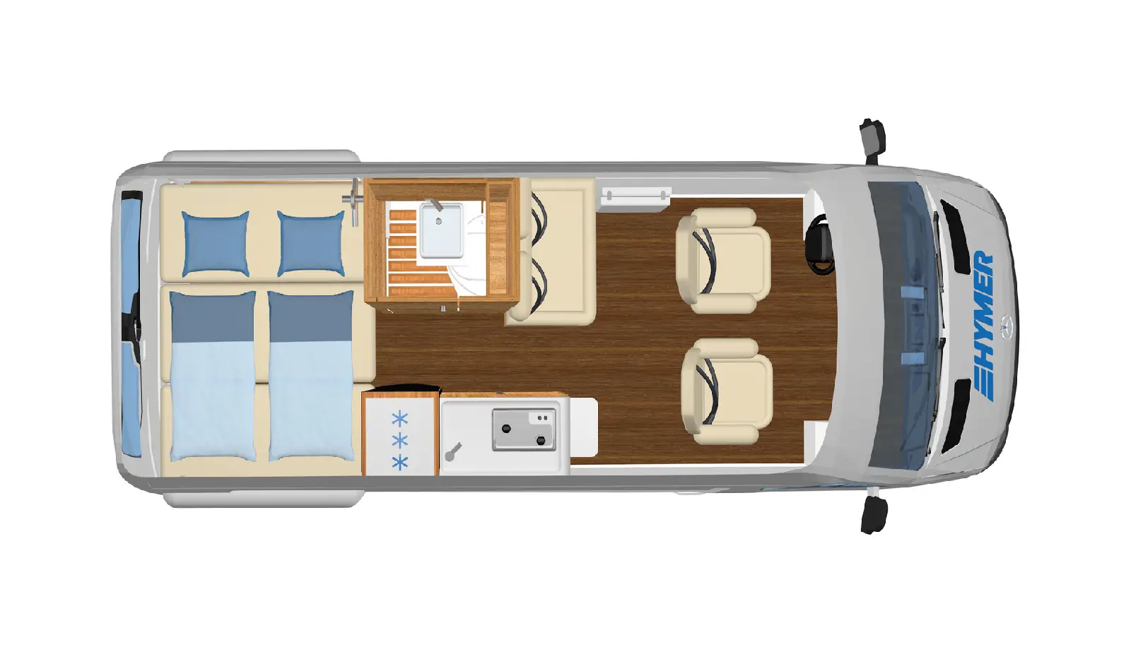 Der B-MLI 790 bietet bis zu 4 Sitz- und Schlafplätze, mit zwei Einzelbetten im Heck, die sich zu einer großen Liegefläche verbinden lassen, sowie einem Hubbett über dem Wohnbereich.