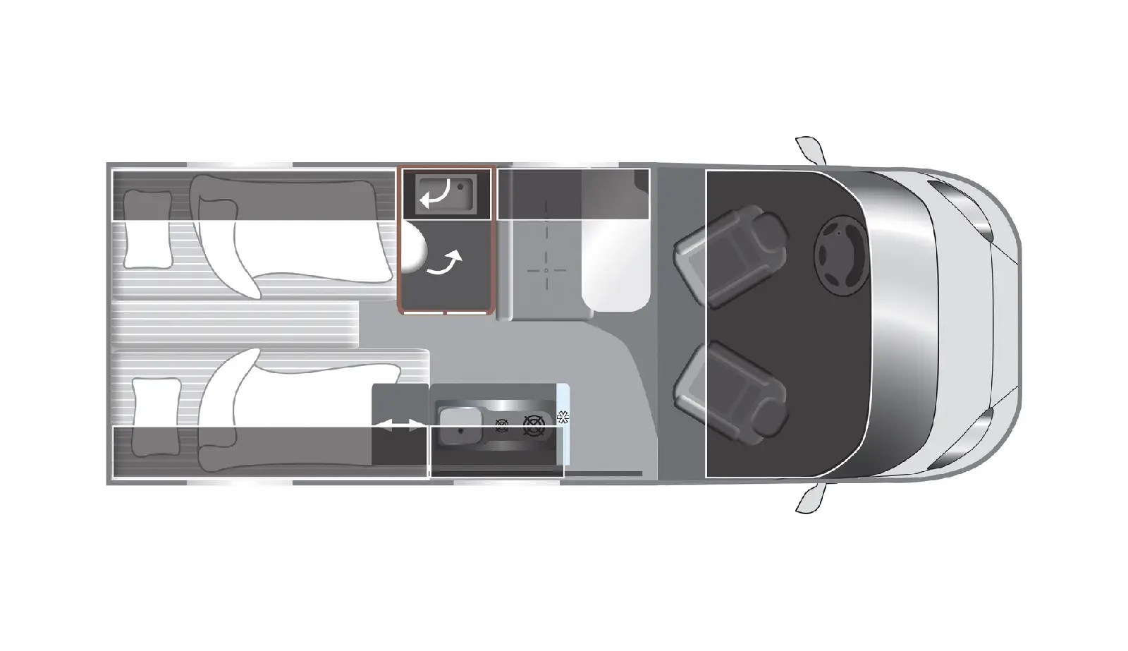 Der T 338 bietet 3–4 Schlafplätze. Das Heckbett ist als Doppelbett ausgelegt, zusätzlich kann die Sitzgruppe im Wohnbereich umgebaut werden.