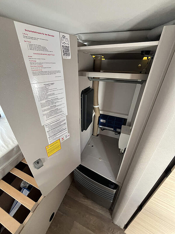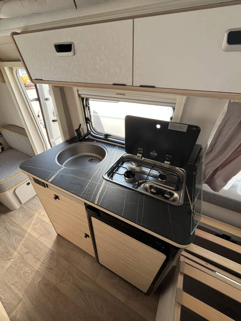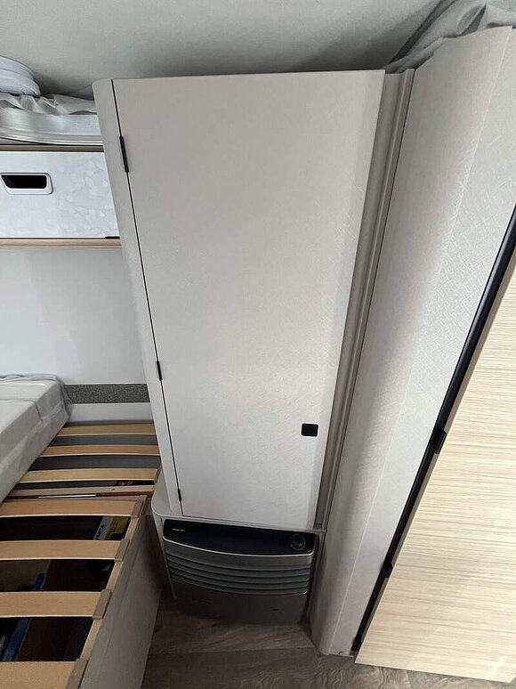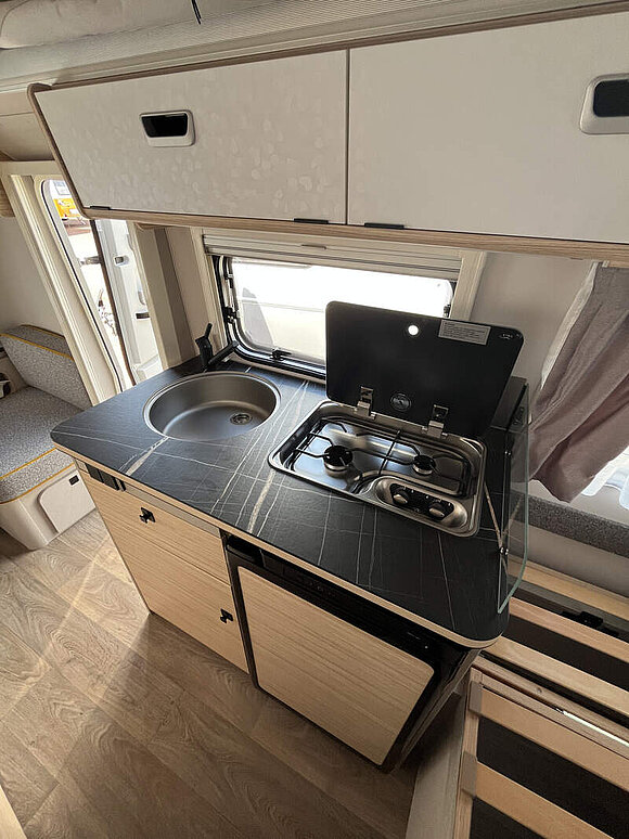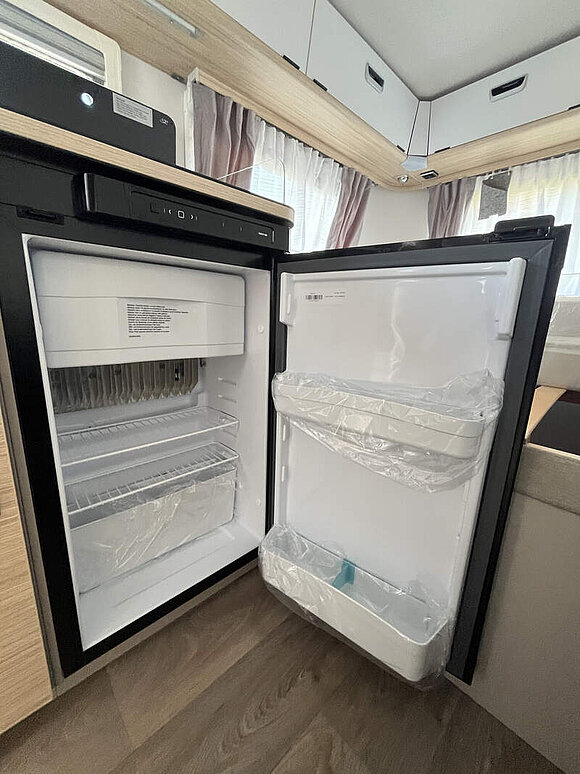 Komfort-Paket (Fliegenschutz-Rolltür (gesamte Türhöhe), bedienfreundlich durch seitliche Führung, Komfort-Plissee-Rollos, Steckdosenpaket (2 x 230 V Steckdosen und 1 x USB-Doppelsteckdose), Abfalleimer in Eingangstür integriert, Spülenabdeckung mit Schneidebrett für Edelstahlspüle, Zusätzlicher Vergrößerungsspiegel mit Magnethalterung)
