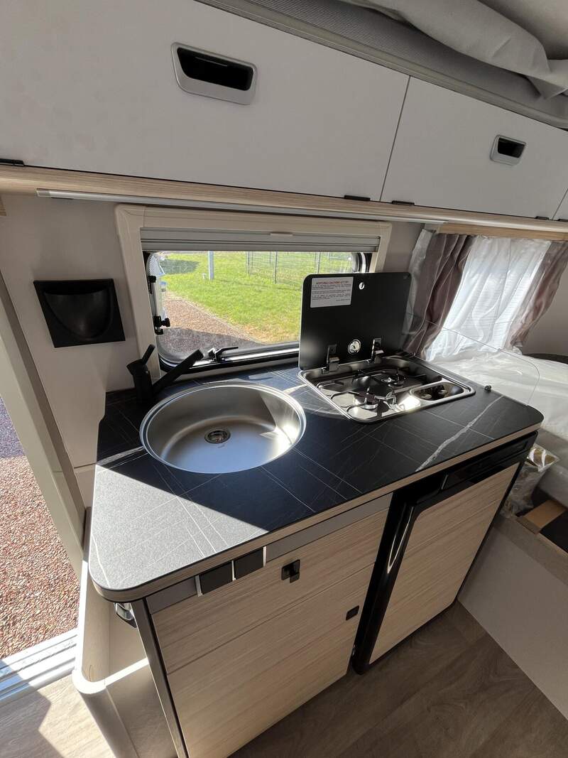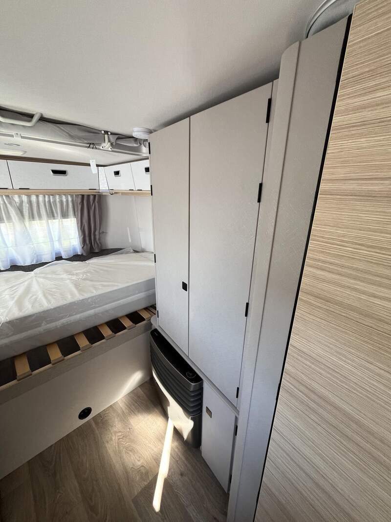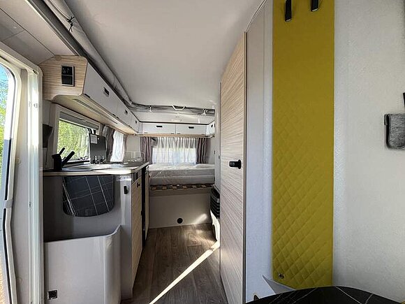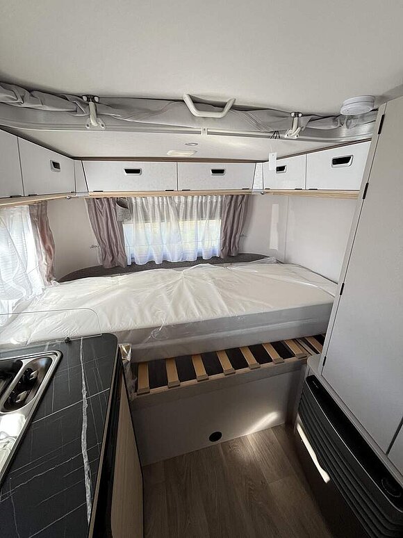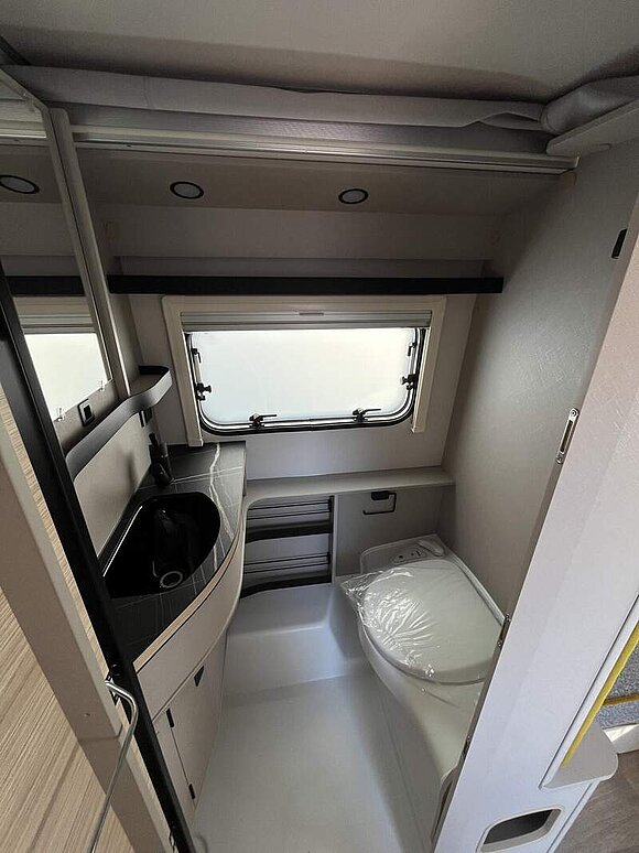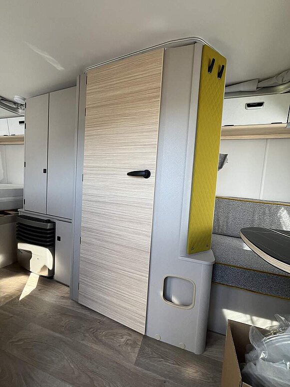 Komfort-Paket (Fliegenschutz-Rolltür (gesamte Türhöhe), bedienfreundlich durch seitliche Führung, Komfort-Plissee-Rollos, Steckdosenpaket (2 x 230 V Steckdosen und 1 x USB-Doppelsteckdose), Abfalleimer in Eingangstür integriert, Spülenabdeckung mit Schneidebrett für Edelstahlspüle, Zusätzlicher Vergrößerungsspiegel mit Magnethalterung)