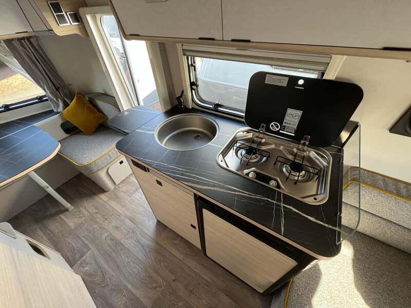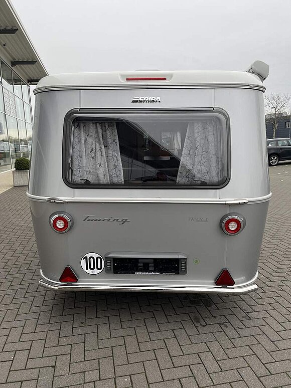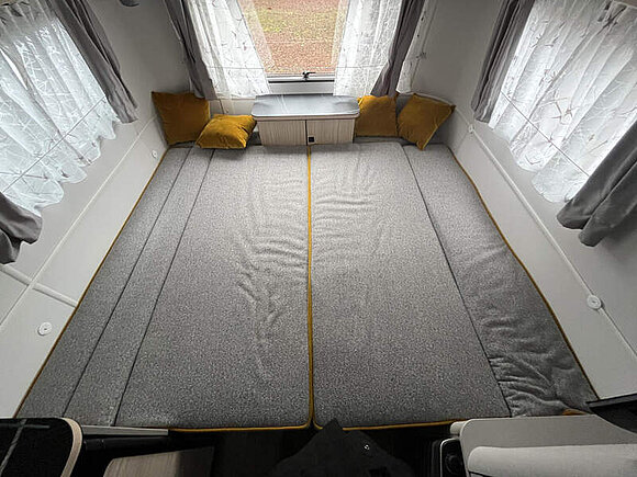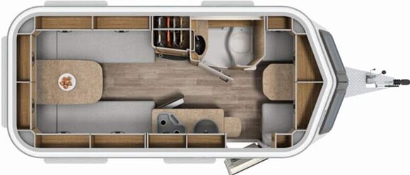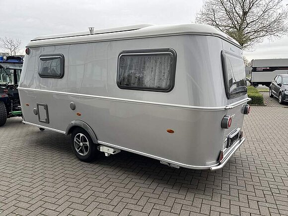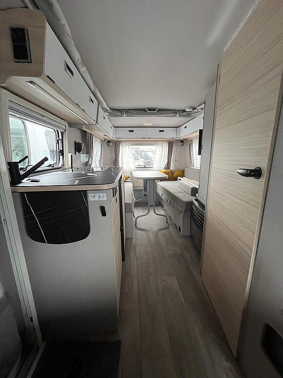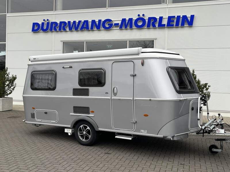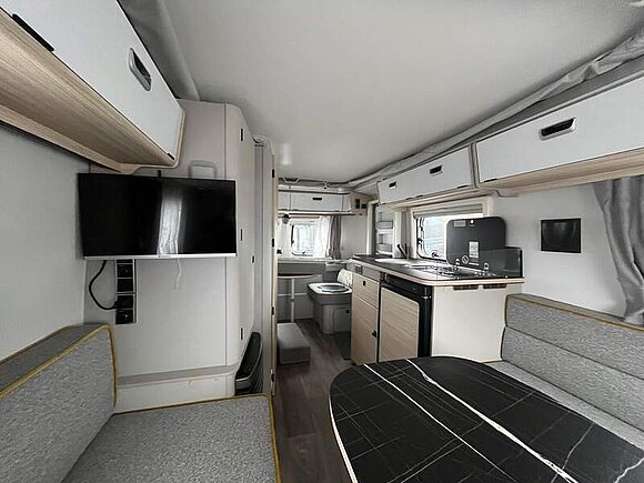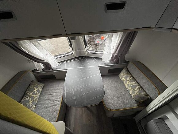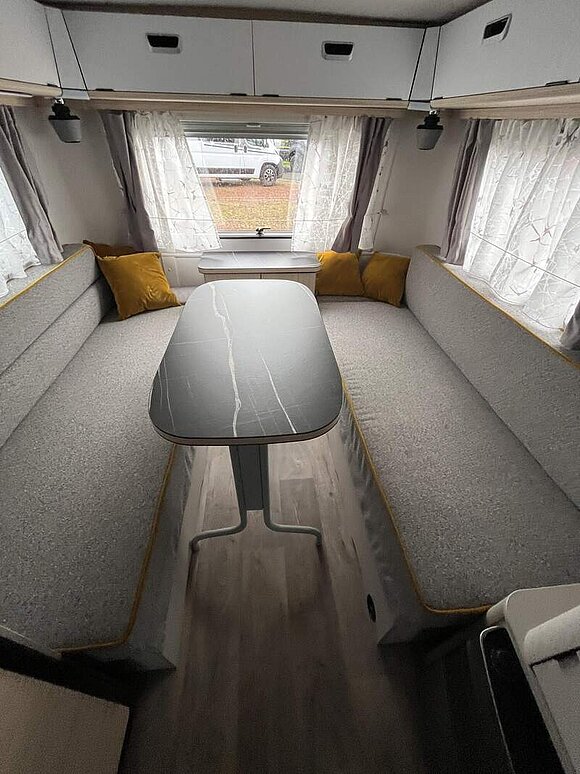 Ausstattungslinie Urban (Seitenwände, Bug und Heck in Glattblech, Farbe White Silver, Möbeldekor Tindari, Ambientelicht XL mit indirektem Licht oberhalb der Dachstauschränke und zwei zusätzliche ERIBA Multifunktions-Akkuleuchten, 2 Kissen mit Bezug)