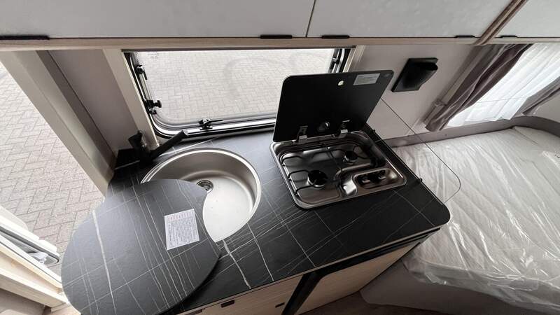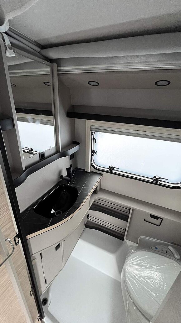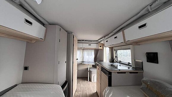 Komfort-Paket (Fliegenschutz-Rolltür (gesamte Türhöhe), bedienfreundlich durch seitliche Führung, Komfort-Plissee-Rollos, Steckdosenpaket (2 x 230 V Steckdosen und 1 x USB-Doppelsteckdose), Abfalleimer in Eingangstür integriert, Spülenabdeckung mit Schneidebrett für Edelstahlspüle, Zusätzlicher Vergrößerungsspiegel mit Magnethalterung)